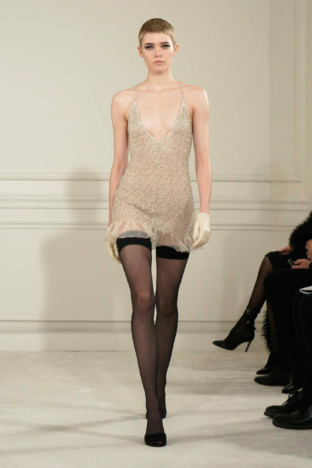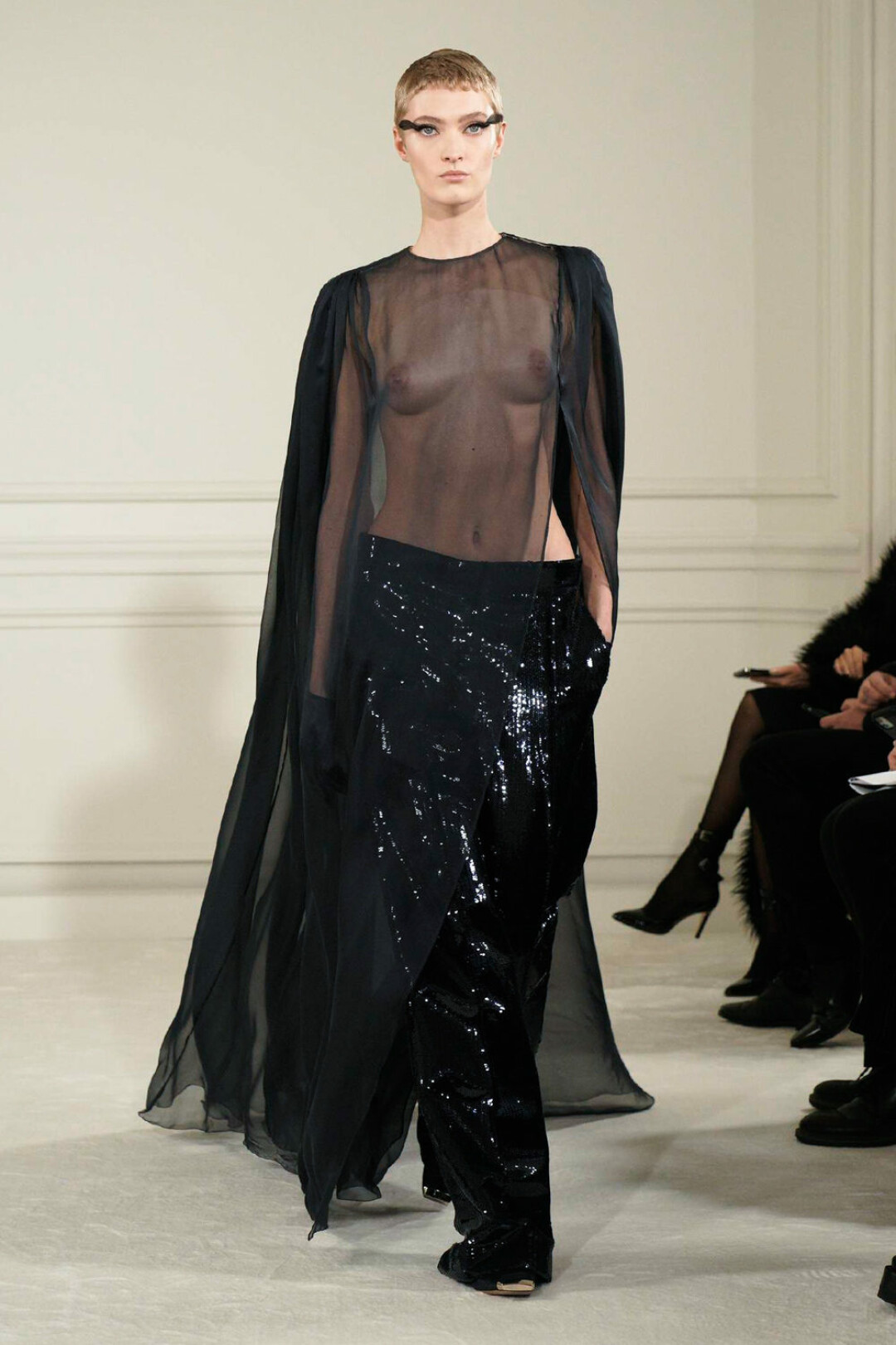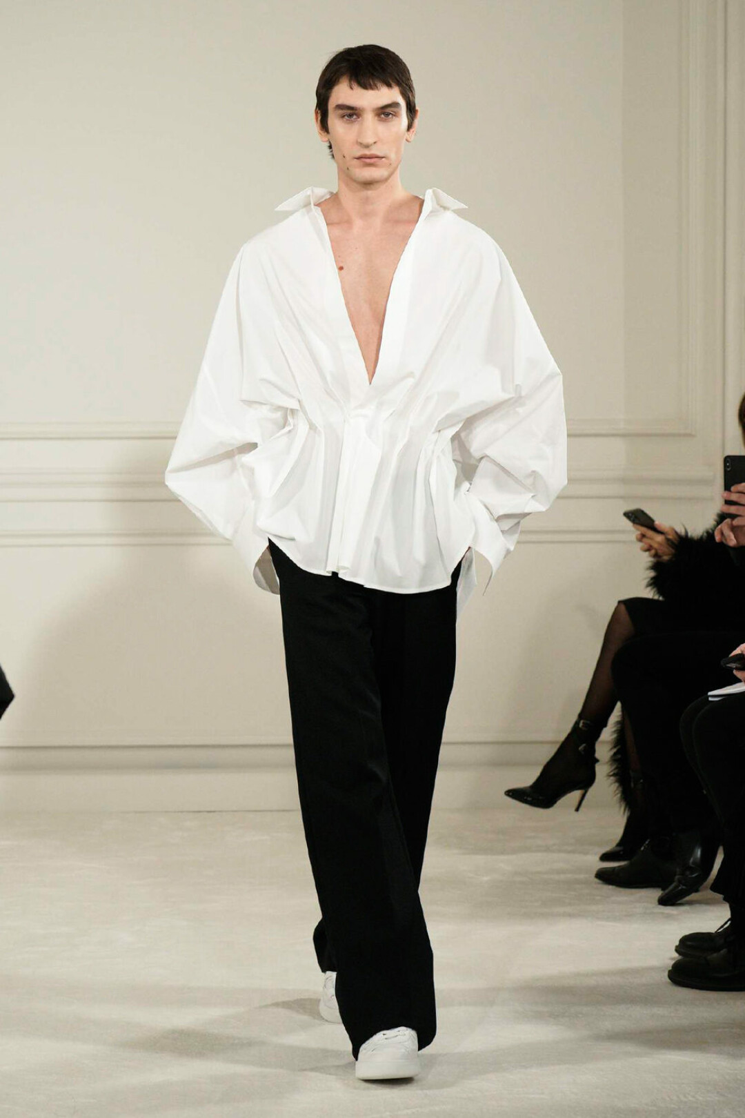 Коллекция Valentino Haute Couture состоит из вечерних платьев в пол (как воздушных из полупрозрачных материалов, так и с объемными юбками), украшенных перьями и пайетками, мини-платьев, демонстрирующих чулки, свободных брюк на низкой посадке и топов со шлейфом. Для мужчин Пьерпаоло Пиччоли создал брюки, аналогичные по силуэту женским, блузы и рубашки с глубоким v-образным вырезом. Многие вещи также украсили пайетки. Креативный директор Valentino славится потрясающей работой с цветой, что лишний раз подтвердил новой кутюрной коллекцией. В ее цветовую палитру вошли как нюдовые, шоколадные, черные и белые оттенки, так и насыщенные красный, розовый, фиолетовый, зеленый, желтый, оранжевый и синий.