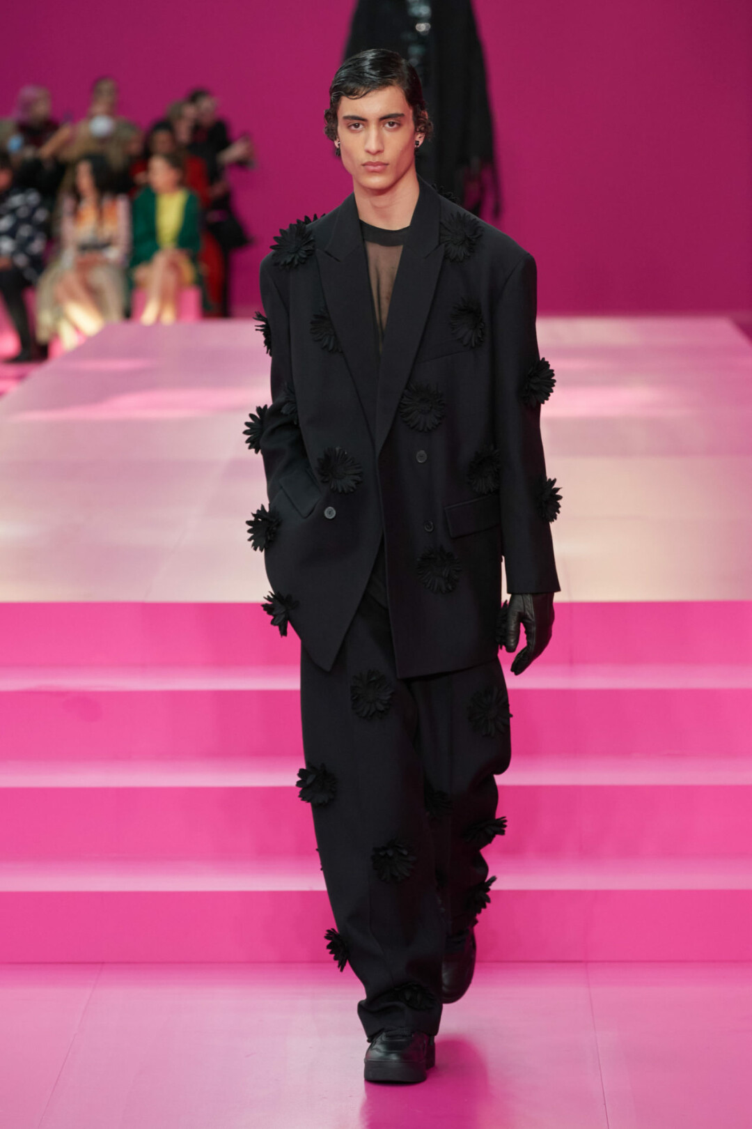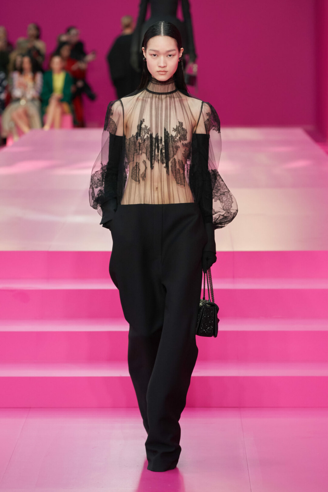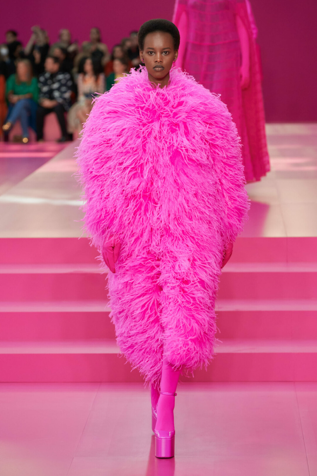 У поклонников творчества Пьерпаоло Пиччоли в сезоне осень-зима 2022-2023 есть два варианта: тотал блэк и тотал пинк. В коллекции нет никаких других цветов, кроме розового и черного. В этом оттенке костюмы, платья, блузы, верхняя одежда: от сдержанных вещей до вечерних, украшенных перьями и пайетками. Все образы дополнила обувь на экстремальной платформе — главном тренде этой весны.
