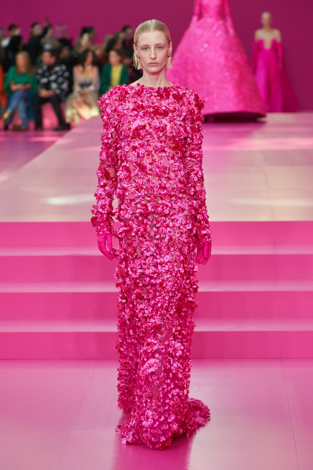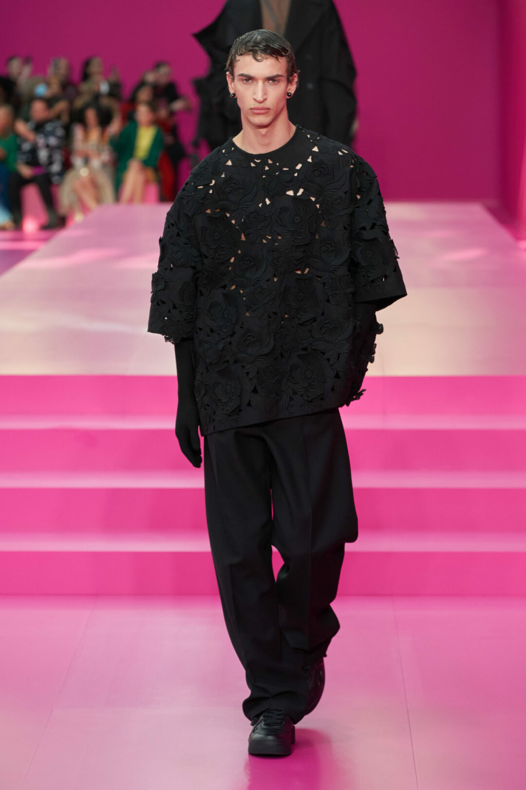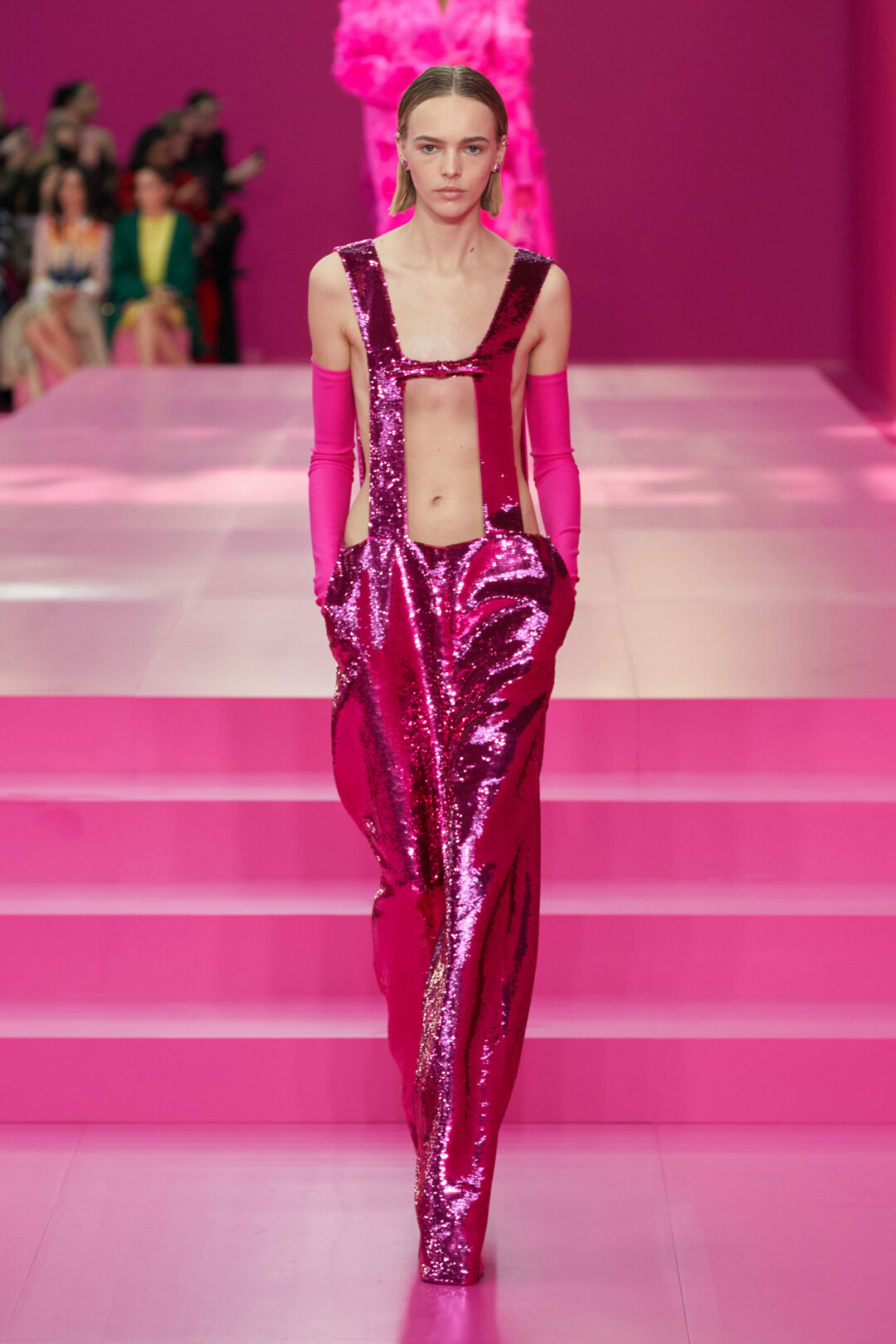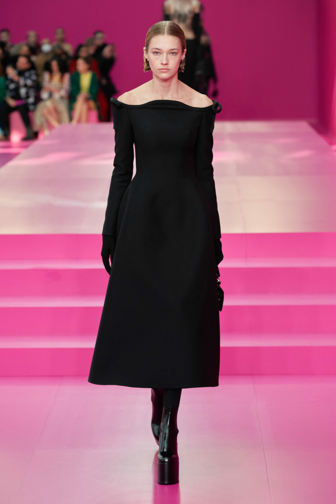 У поклонников творчества Пьерпаоло Пиччоли в сезоне осень-зима 2022-2023 есть два варианта: тотал блэк и тотал пинк. В коллекции нет никаких других цветов, кроме розового и черного. В этом оттенке костюмы, платья, блузы, верхняя одежда: от сдержанных вещей до вечерних, украшенных перьями и пайетками. Все образы дополнила обувь на экстремальной платформе — главном тренде этой весны.