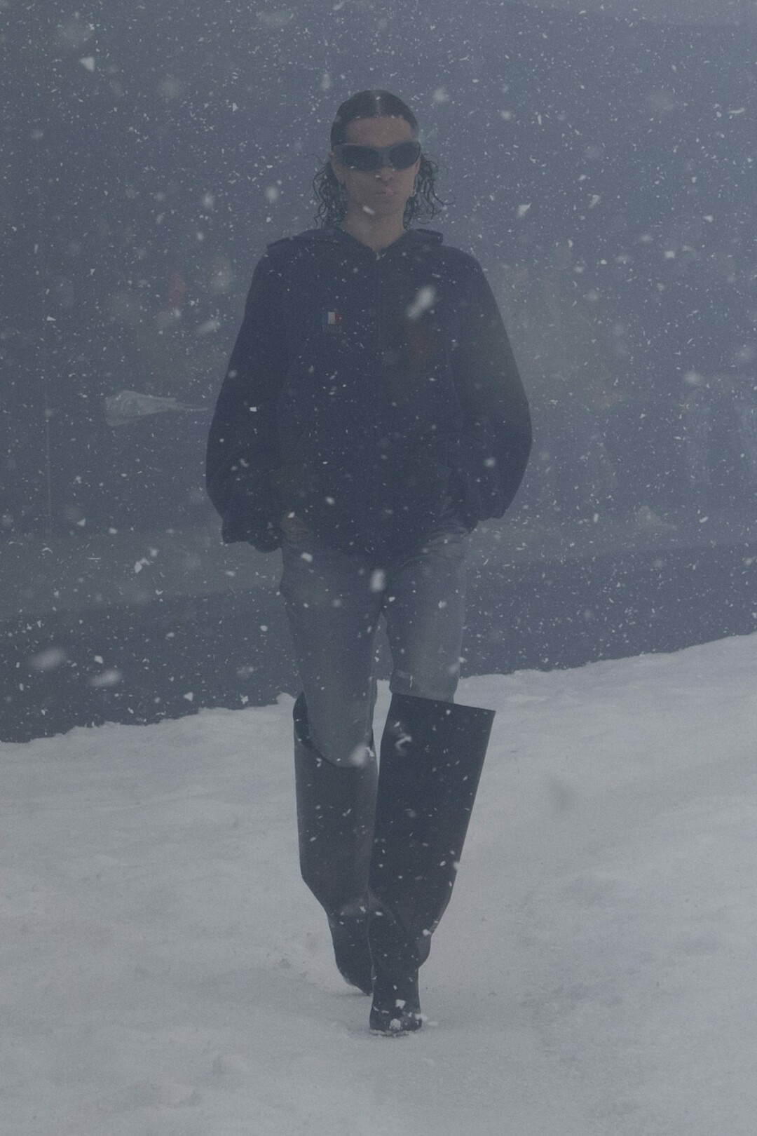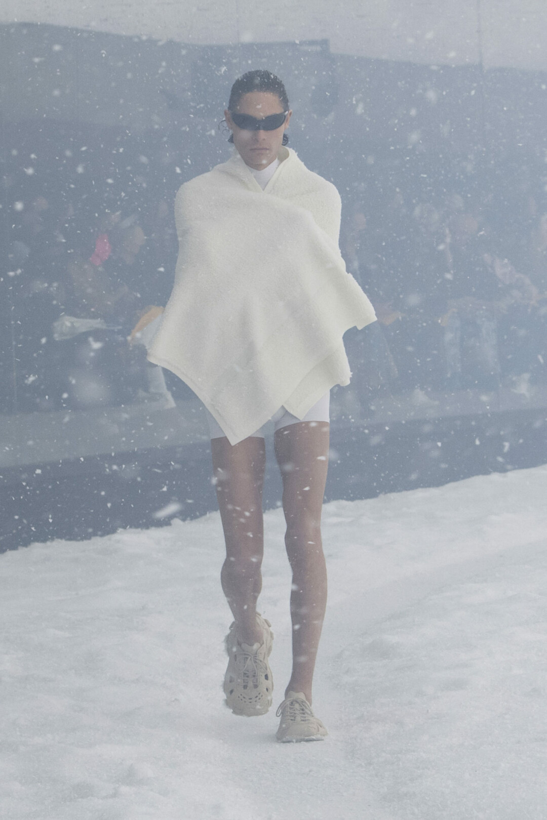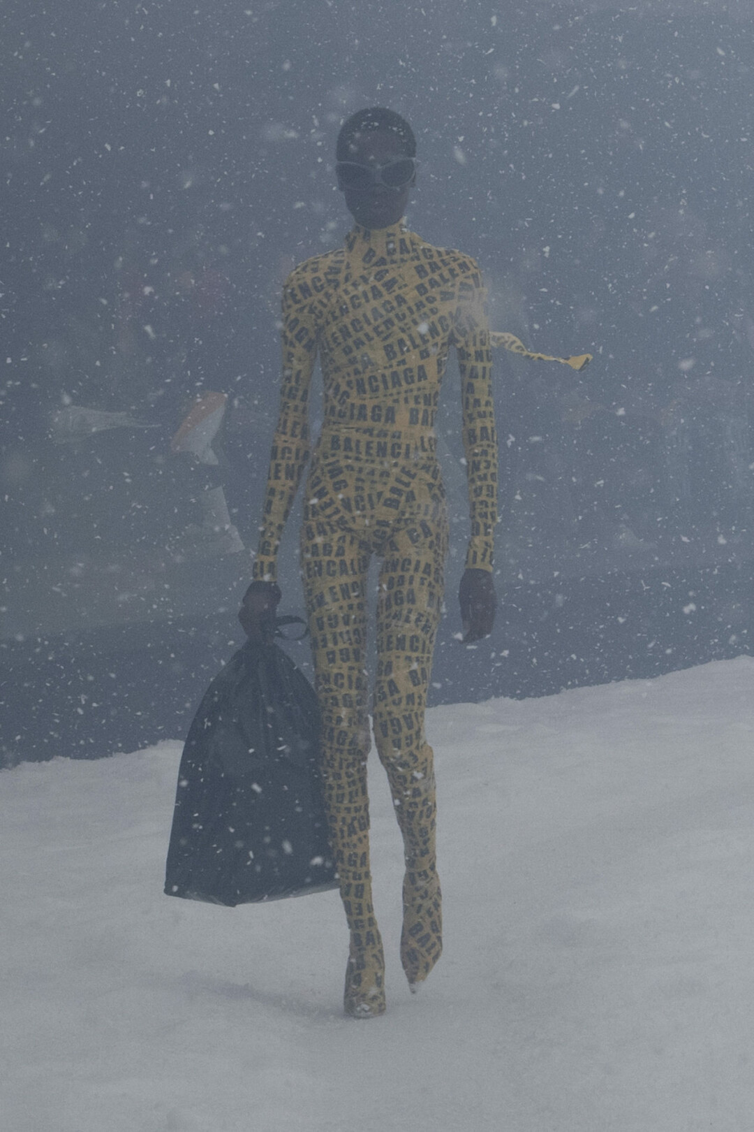 В Париже прошел показ Balenciaga, который запомнился, в первую очередь, сет-дизайном. Модели пробирались по подиуму сквозь метель, шли по сугробам, застревая шпильками в снегу. Креативный директор модного дома Демна Гвасалия посвятил шоу беженцам (дизайнер сам бежал из Грузии в 1993 году во время грузинско-абхазского конфликта).