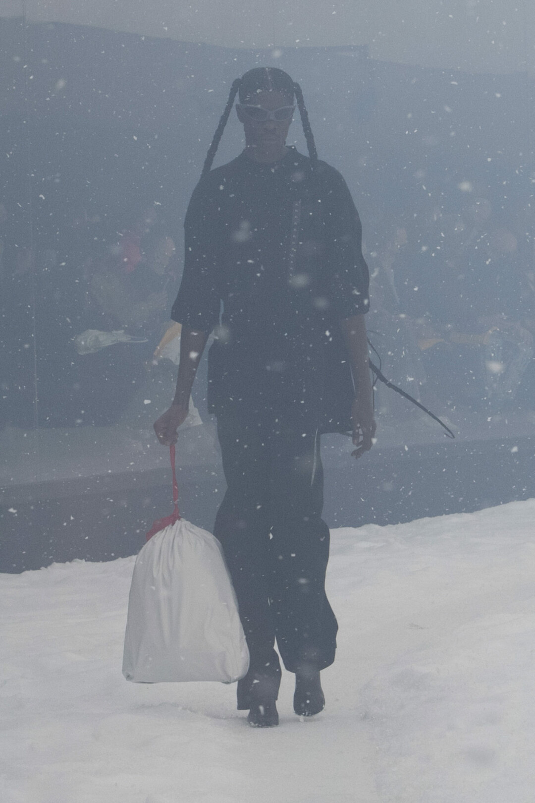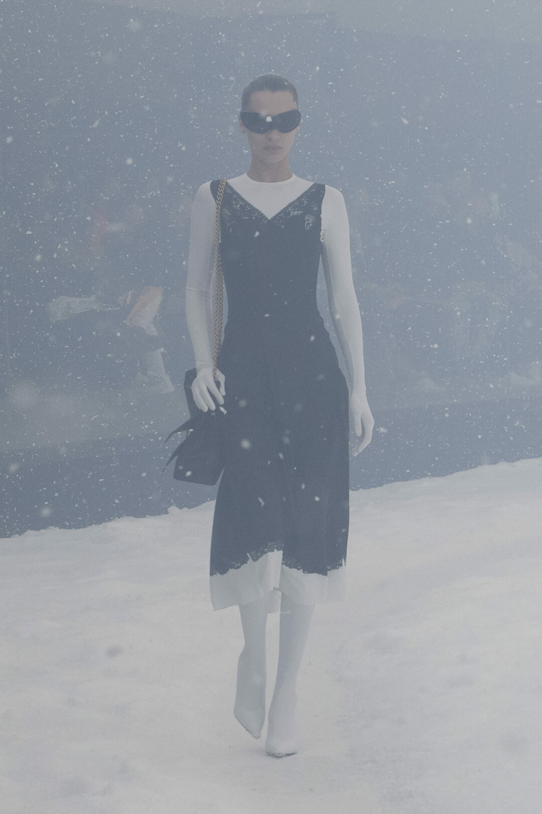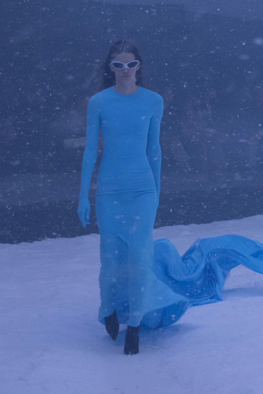 В Париже прошел показ Balenciaga, который запомнился, в первую очередь, сет-дизайном. Модели пробирались по подиуму сквозь метель, шли по сугробам, застревая шпильками в снегу. Креативный директор модного дома Демна Гвасалия посвятил шоу беженцам (дизайнер сам бежал из Грузии в 1993 году во время грузинско-абхазского конфликта).