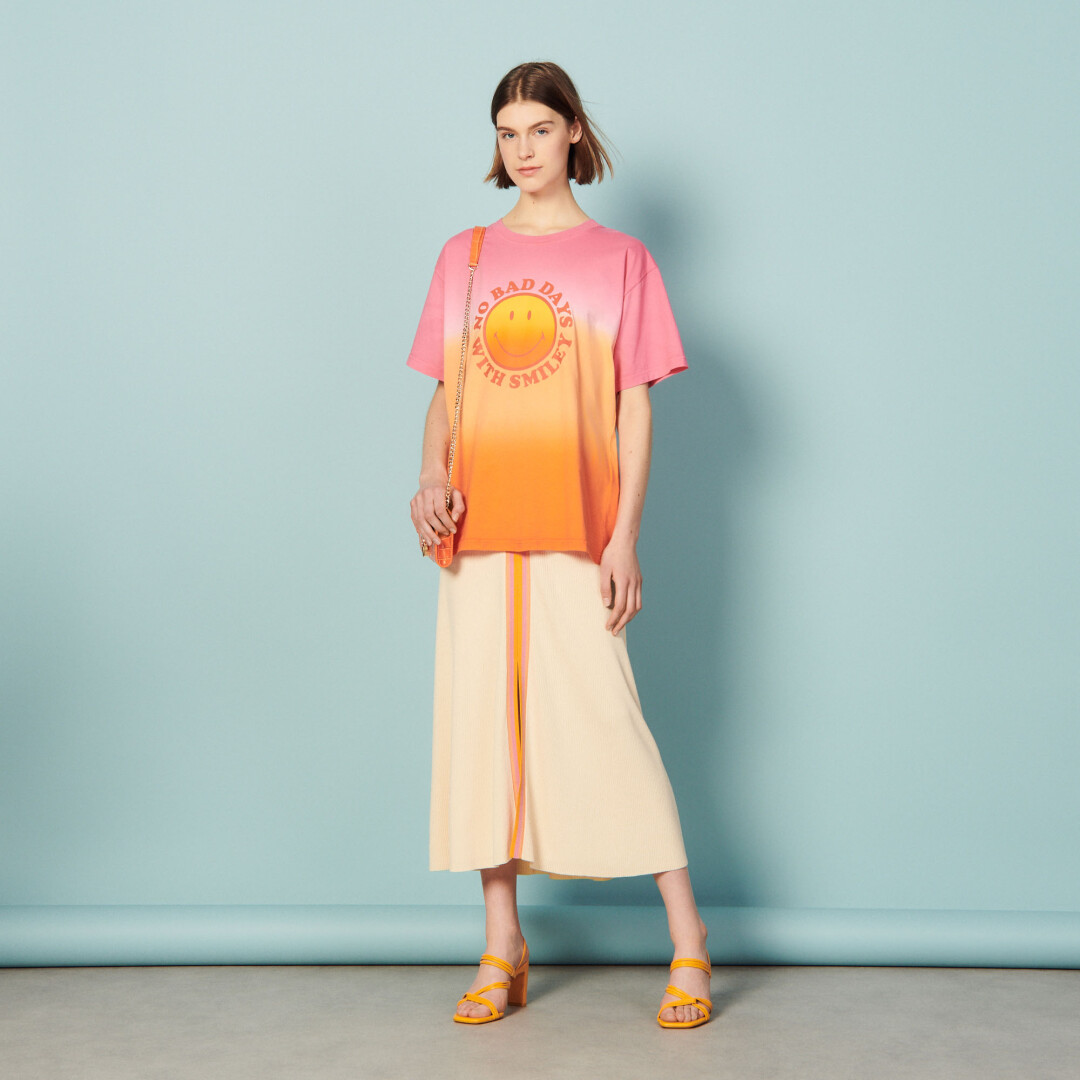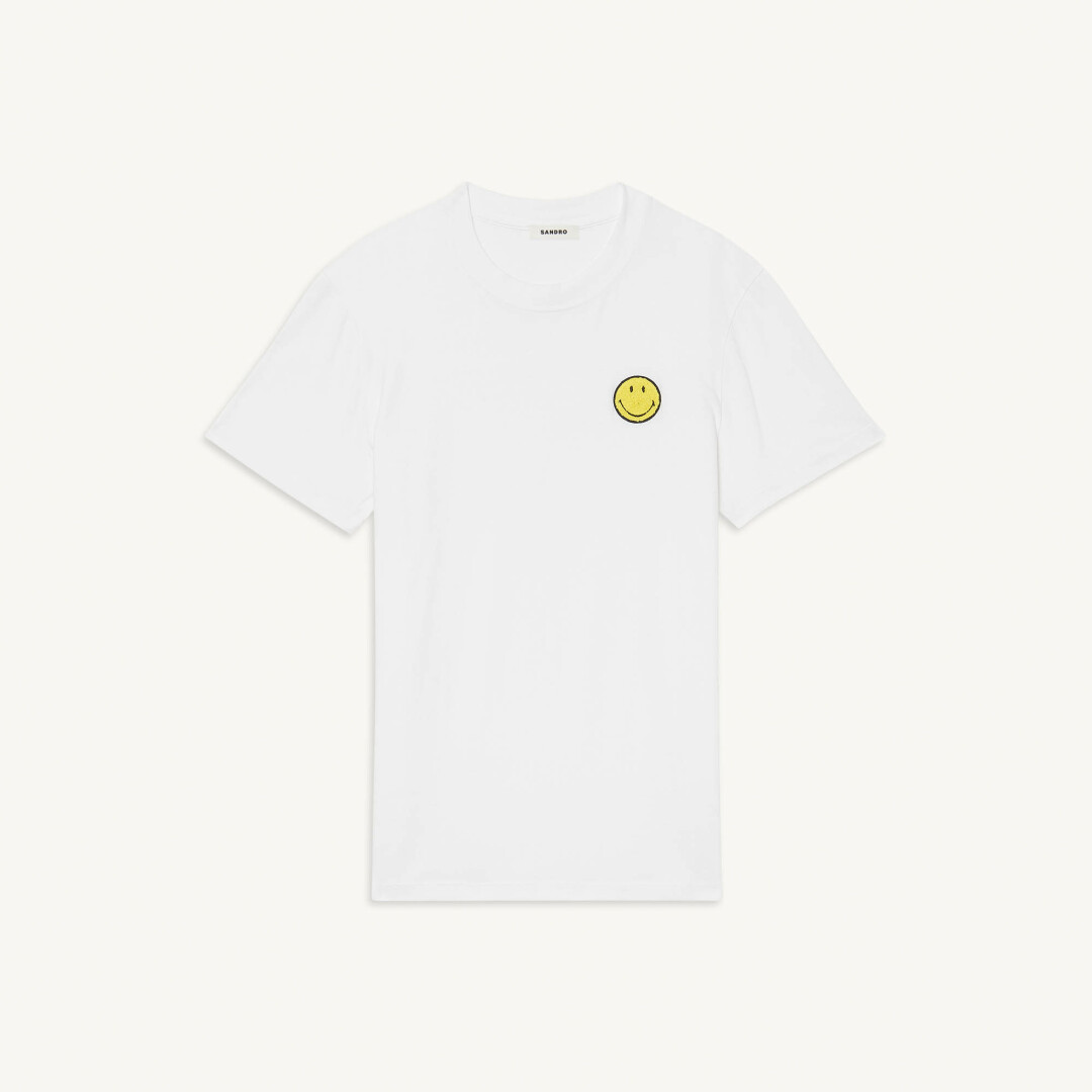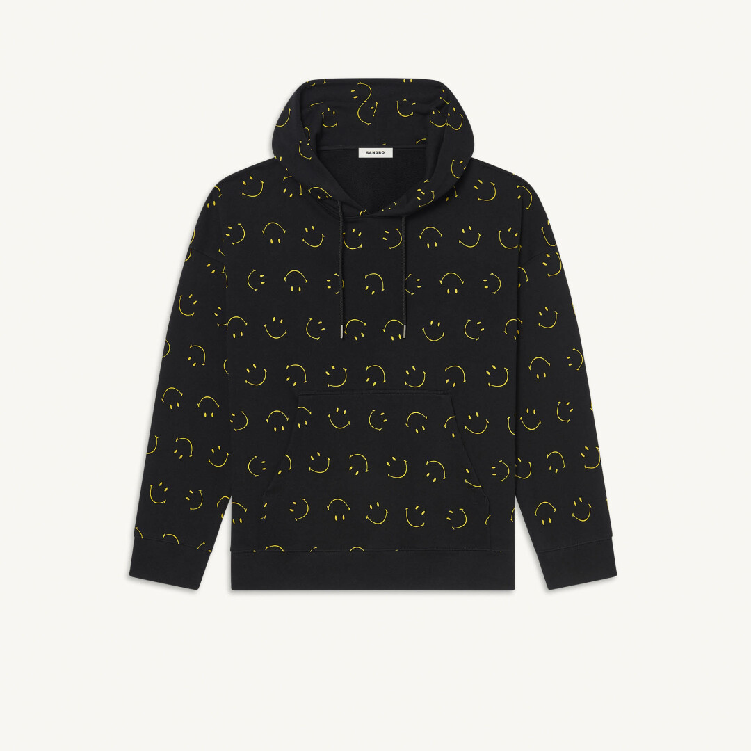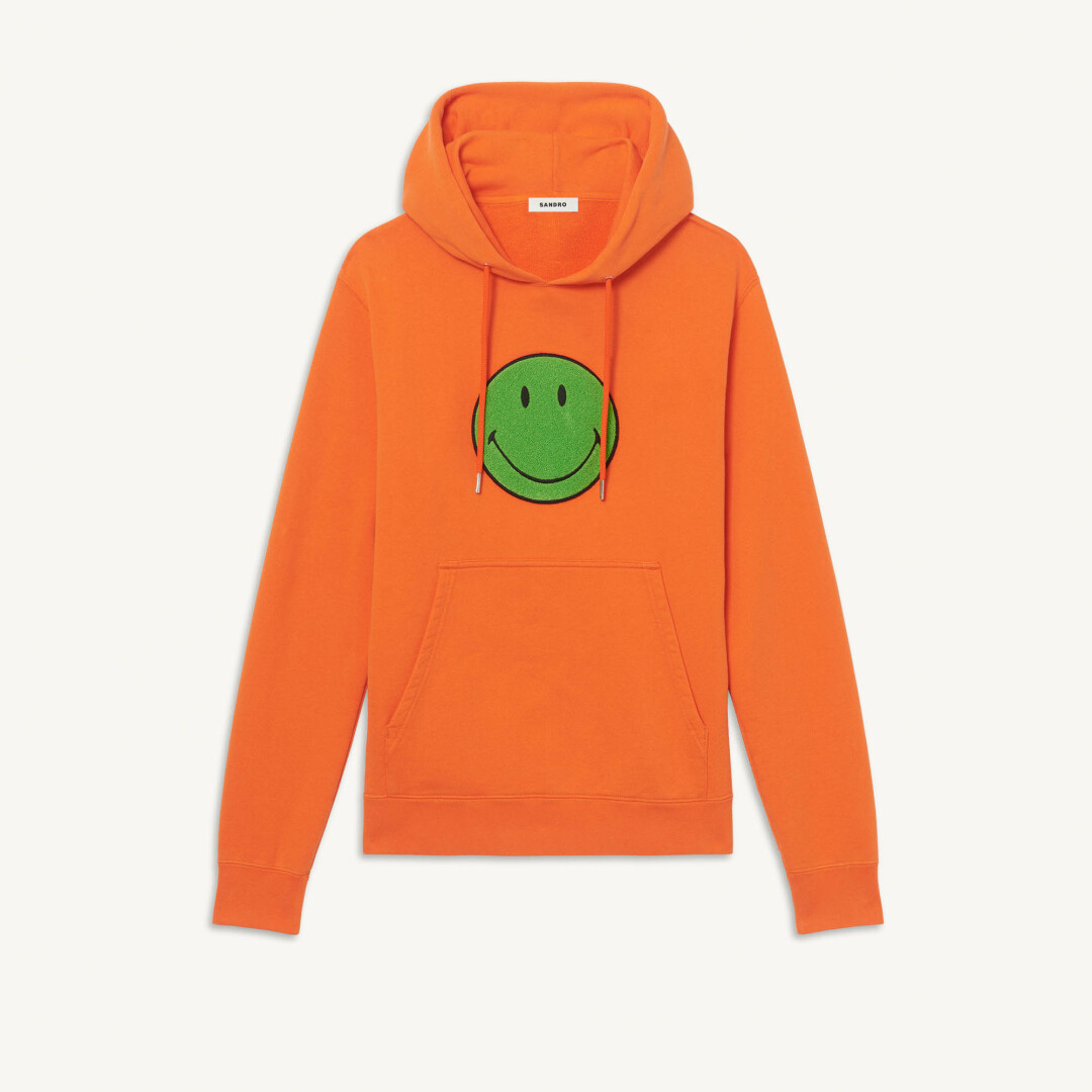 Визуальная составляющая французского бренда Sandro тесно связана со смайликом. Узнаваемый во всем мире символ даже становился главным героем коллекций марки. Кроме того, смайл появлялся и регулярно появляется в качестве принта, нашивки и вышивки на кардиганах, футболках, шортах, худи, рубашках, юбках и аксессуарах Sandro.