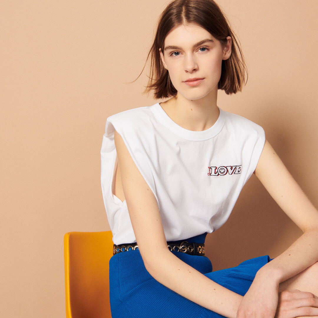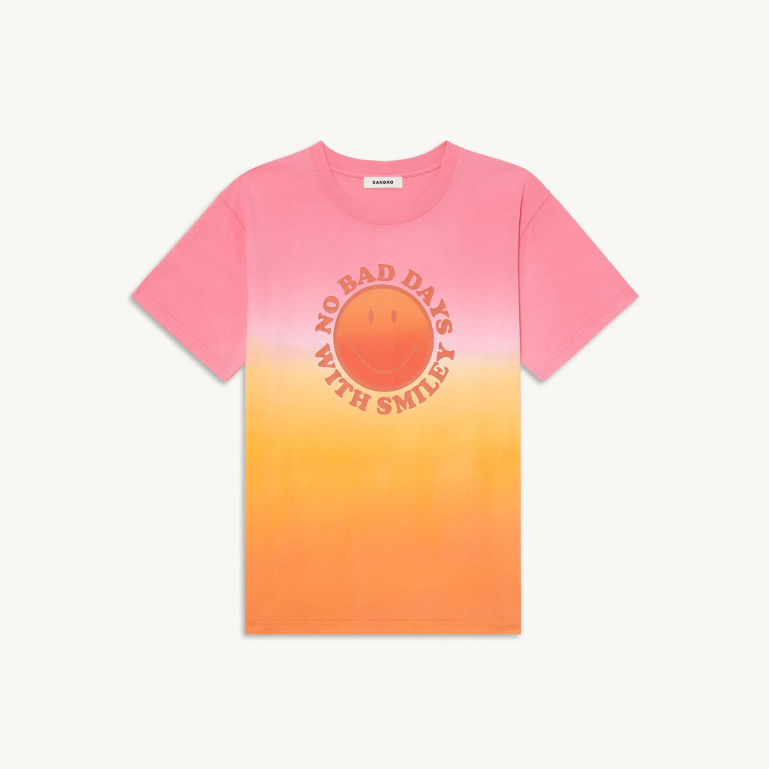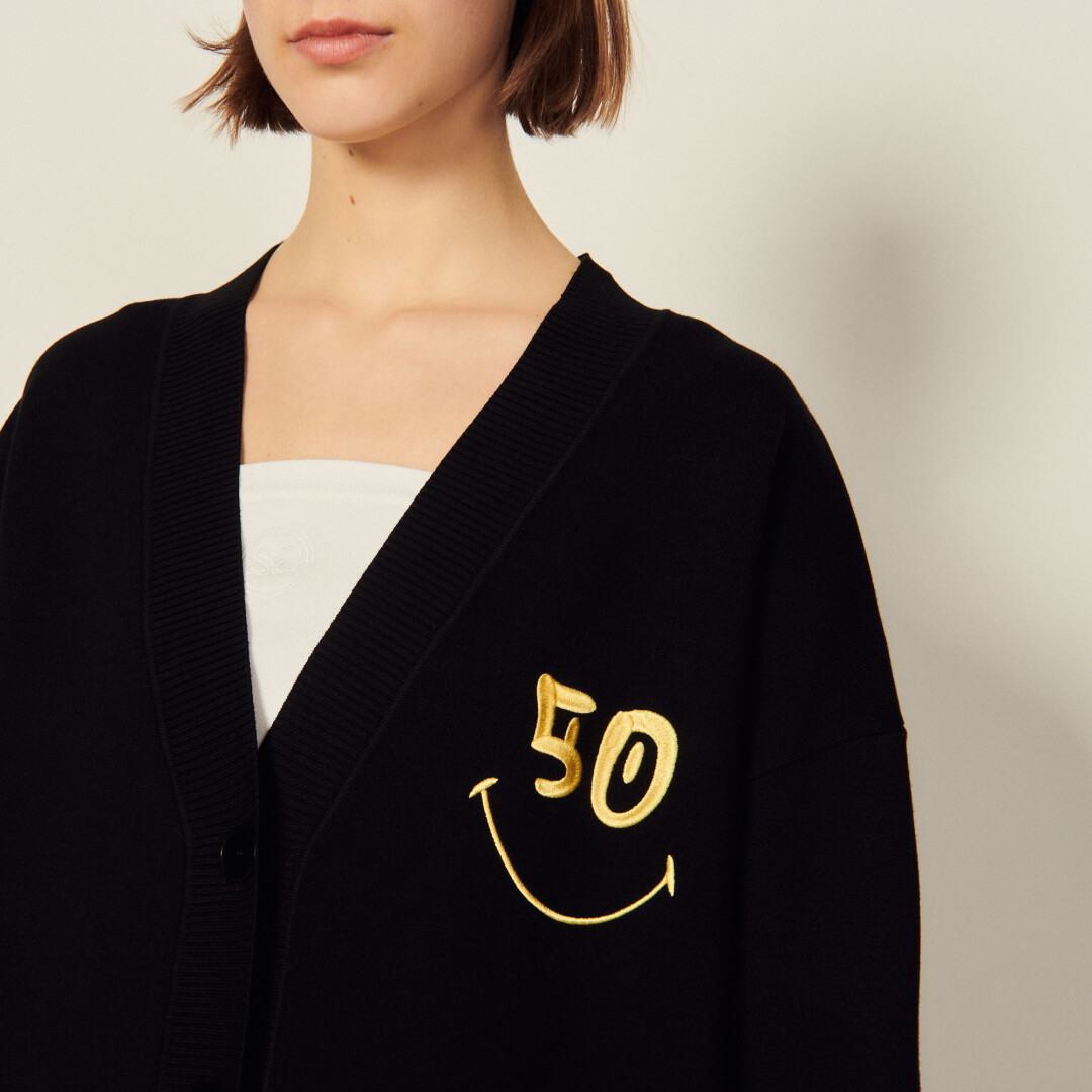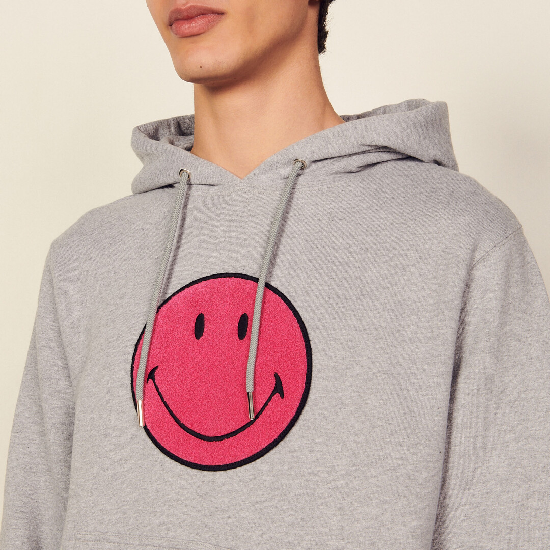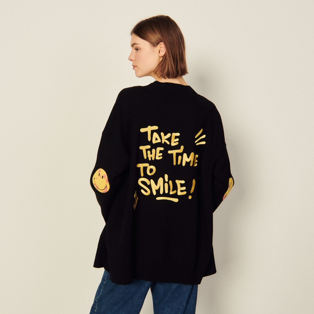 Визуальная составляющая французского бренда Sandro тесно связана со смайликом. Узнаваемый во всем мире символ даже становился главным героем коллекций марки. Кроме того, смайл появлялся и регулярно появляется в качестве принта, нашивки и вышивки на кардиганах, футболках, шортах, худи, рубашках, юбках и аксессуарах Sandro.