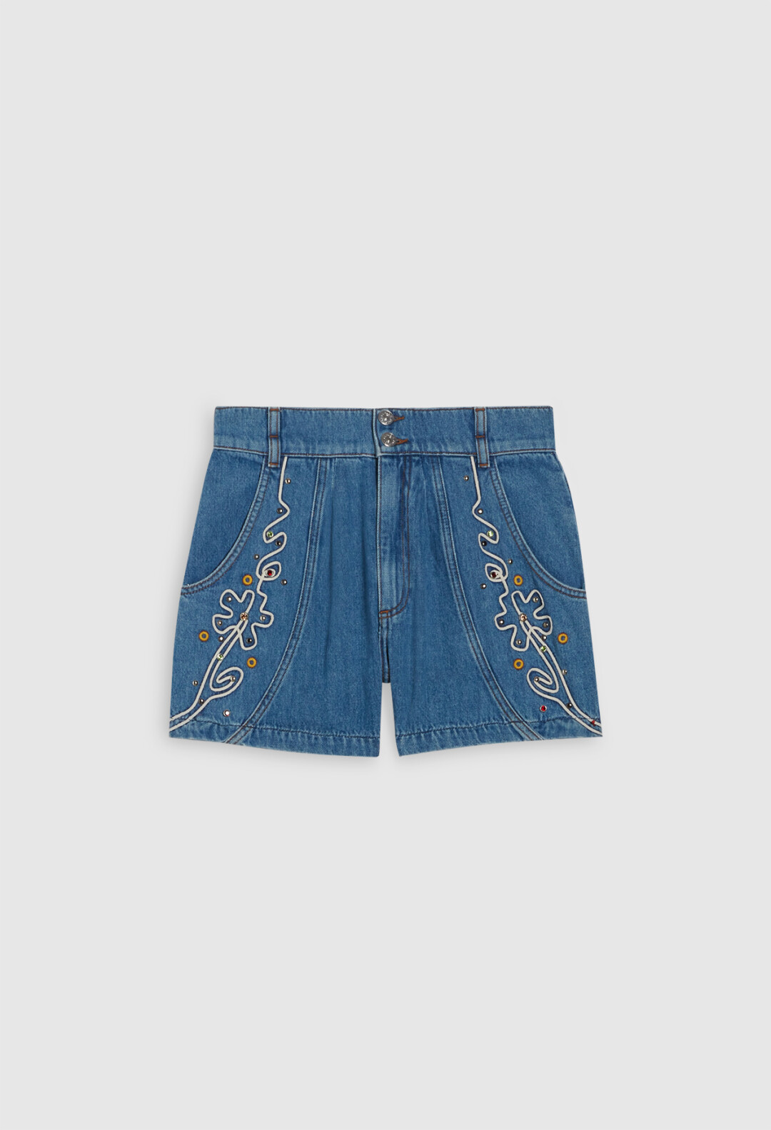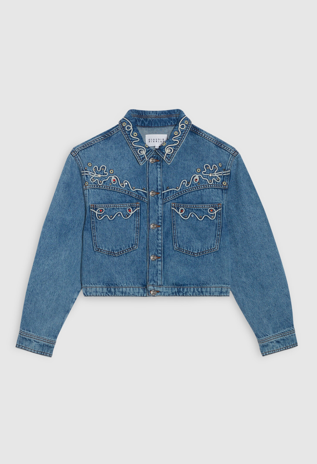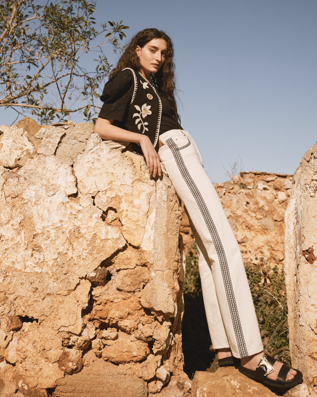 В летнюю коллекцию Claudie Pierlot вошли вещи с графичными вышивками, платье на молнии белого оттенка, будто выгоревшего на солнце, такого же цвета брюки и жакет, джинсовые и вязаные комплекты, мини-платья, а также платье длины макси с запахом и рукавами-фонариками. Дополнять образы дизайнеры бренда советуют удобными сандалиями и плетеными панамами.