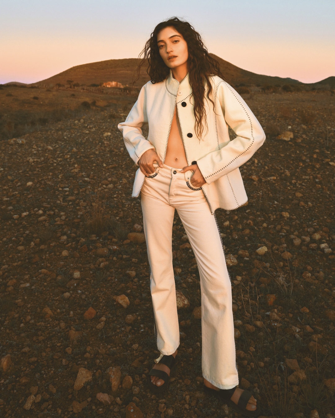 Белоснежный костюм Claudie Pierlot в стиле сафари из плотного, будто бы винтажного хлопка — идеальный мэтч не только для марокканской пустыни, но и для воскресного городского бранча.