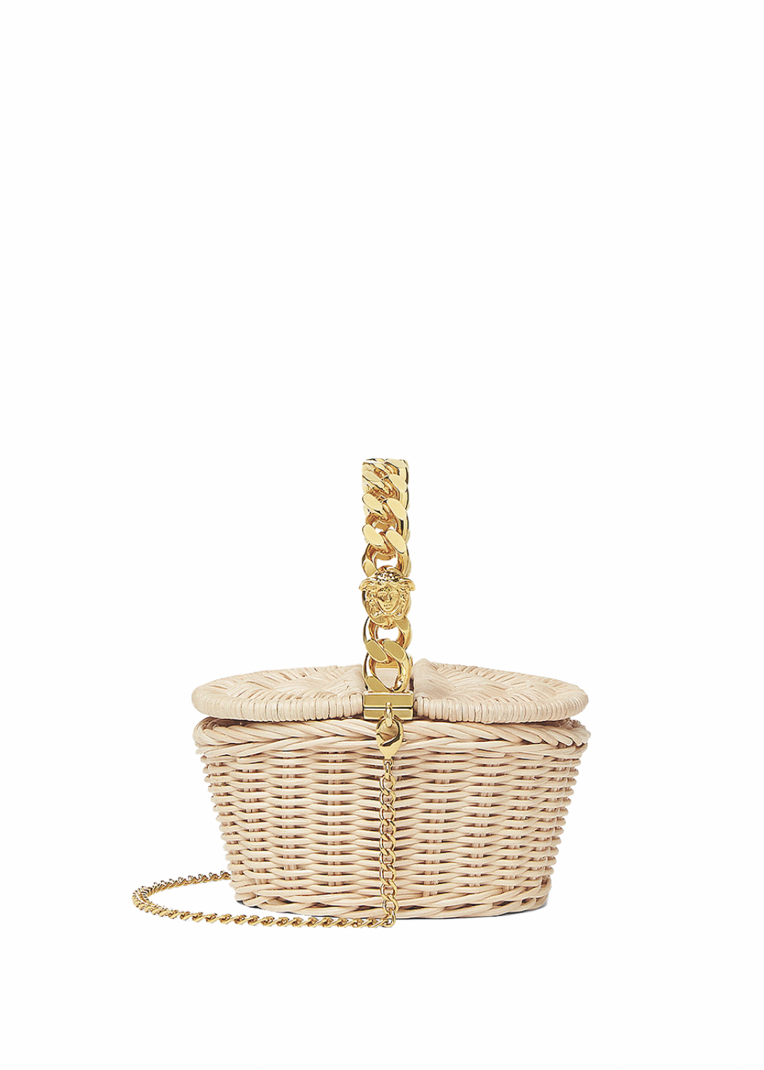 Летний маст-хэв? Сумка-корзинка Versace: даже на пасторальном соломенном фоне Донателла Версаче сумела изящно разместить логотип бренда — золотую Медузу Горгону.