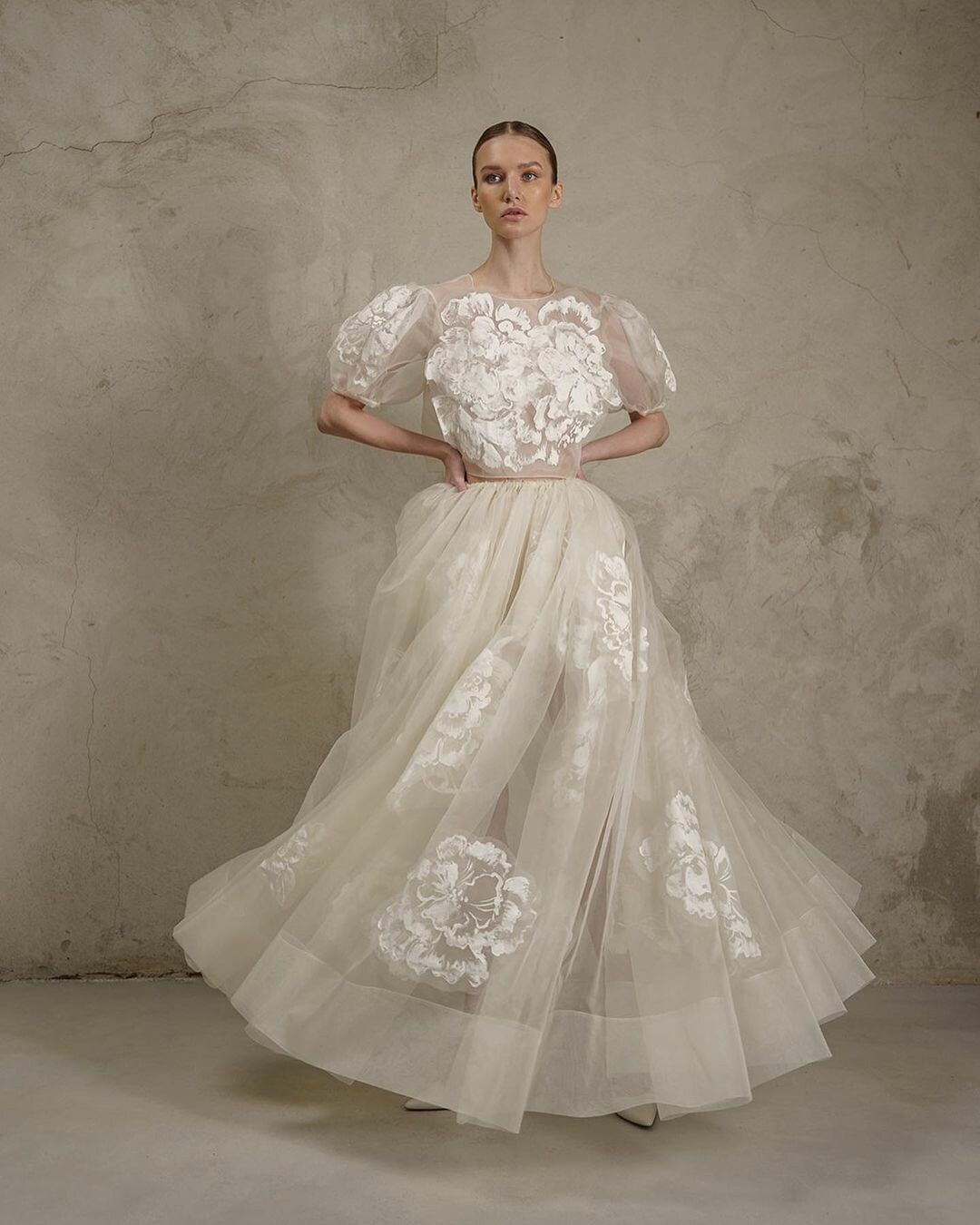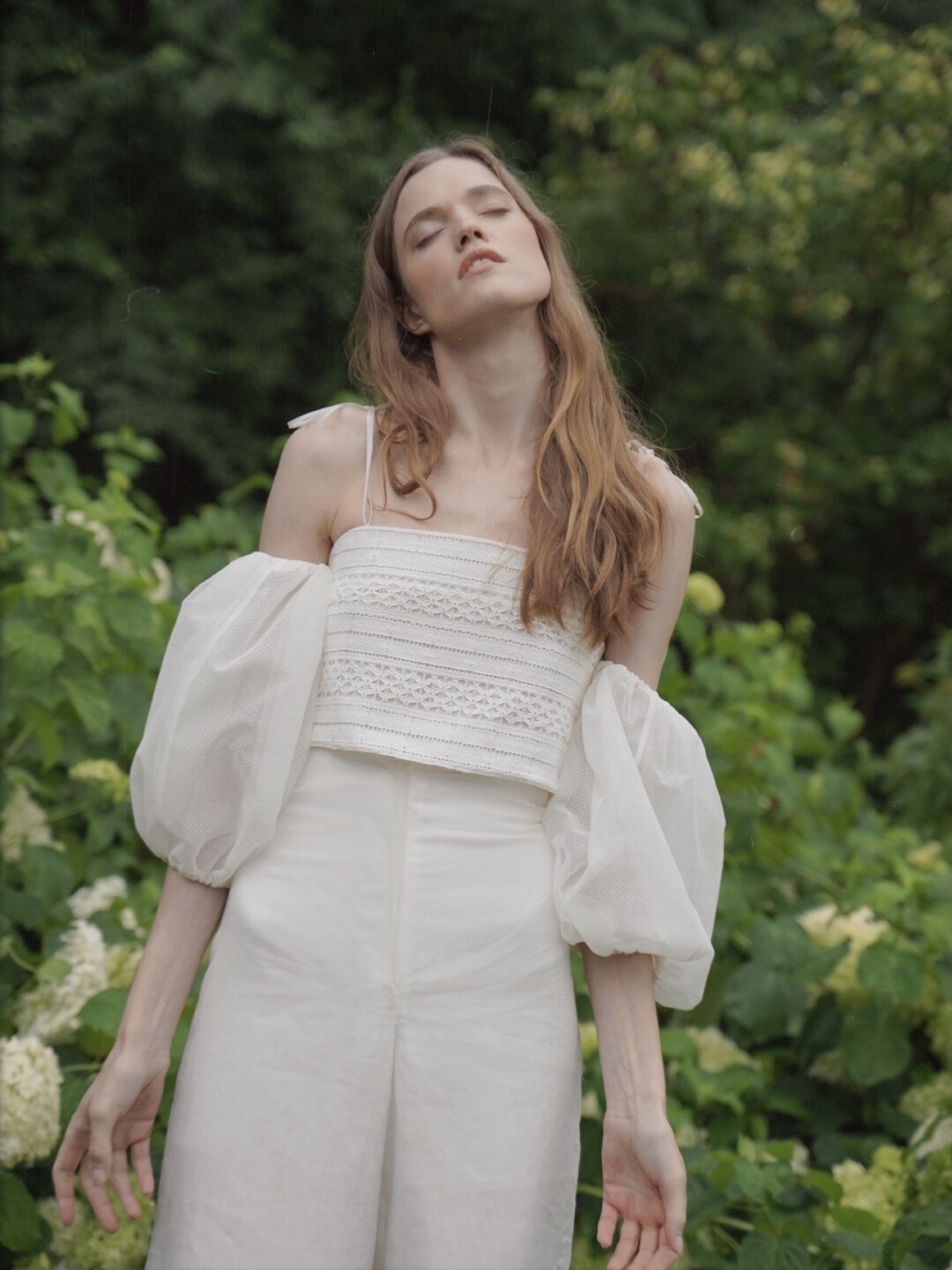 Мини-юбка, платье с рукавами-фонариками, блуза с воротником-стойкой, прозрачное платье-рубашка, брюки палаццо, корсет, классический топ — и все это из воздушного шелка и натурального хлопка. Вещи марки действительно как будто парят, делая невесту невесомой. Можно самой собрать свадебный комплект из отдельных вещей или сделать выбор в пользу традиционной комбинации.