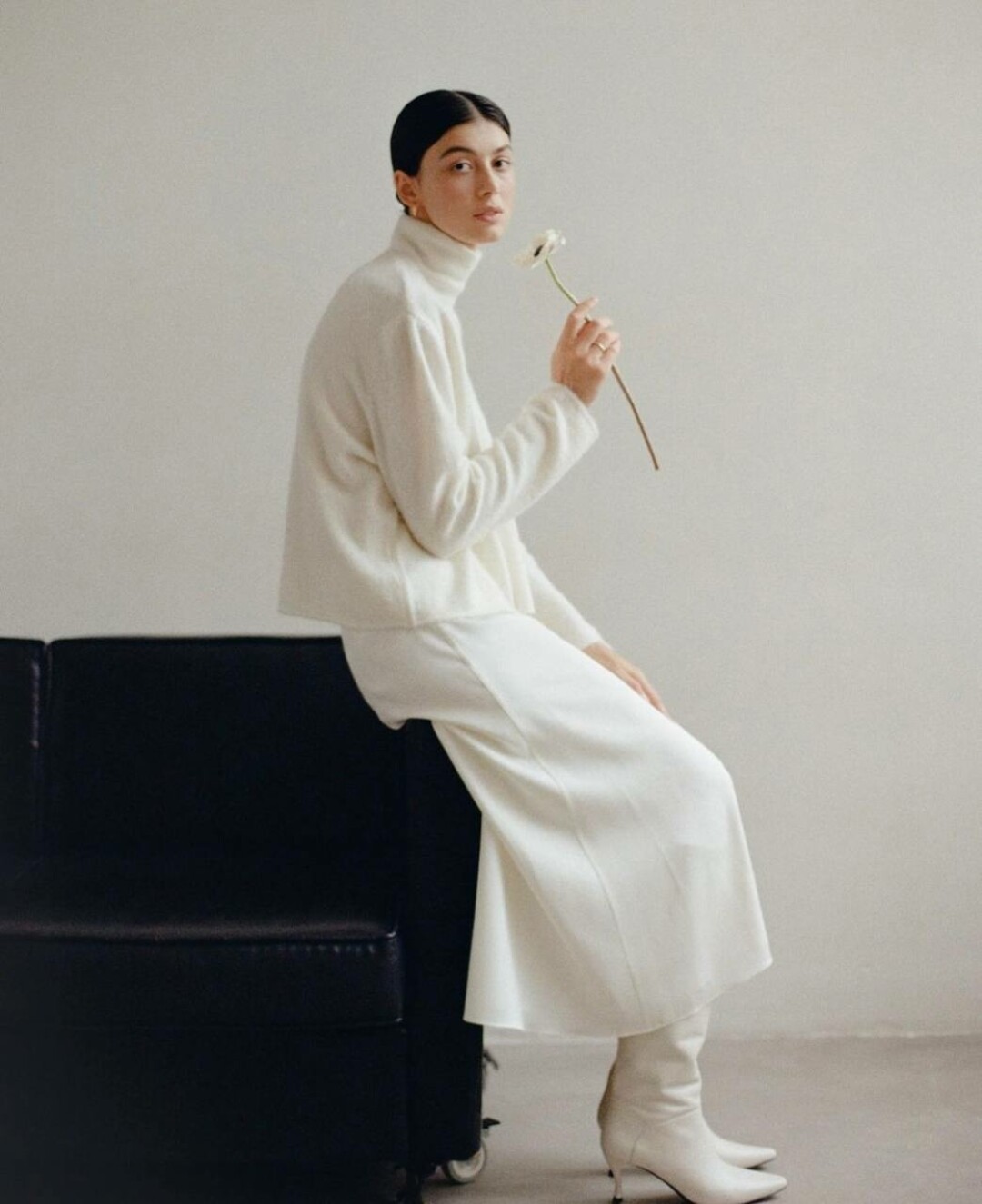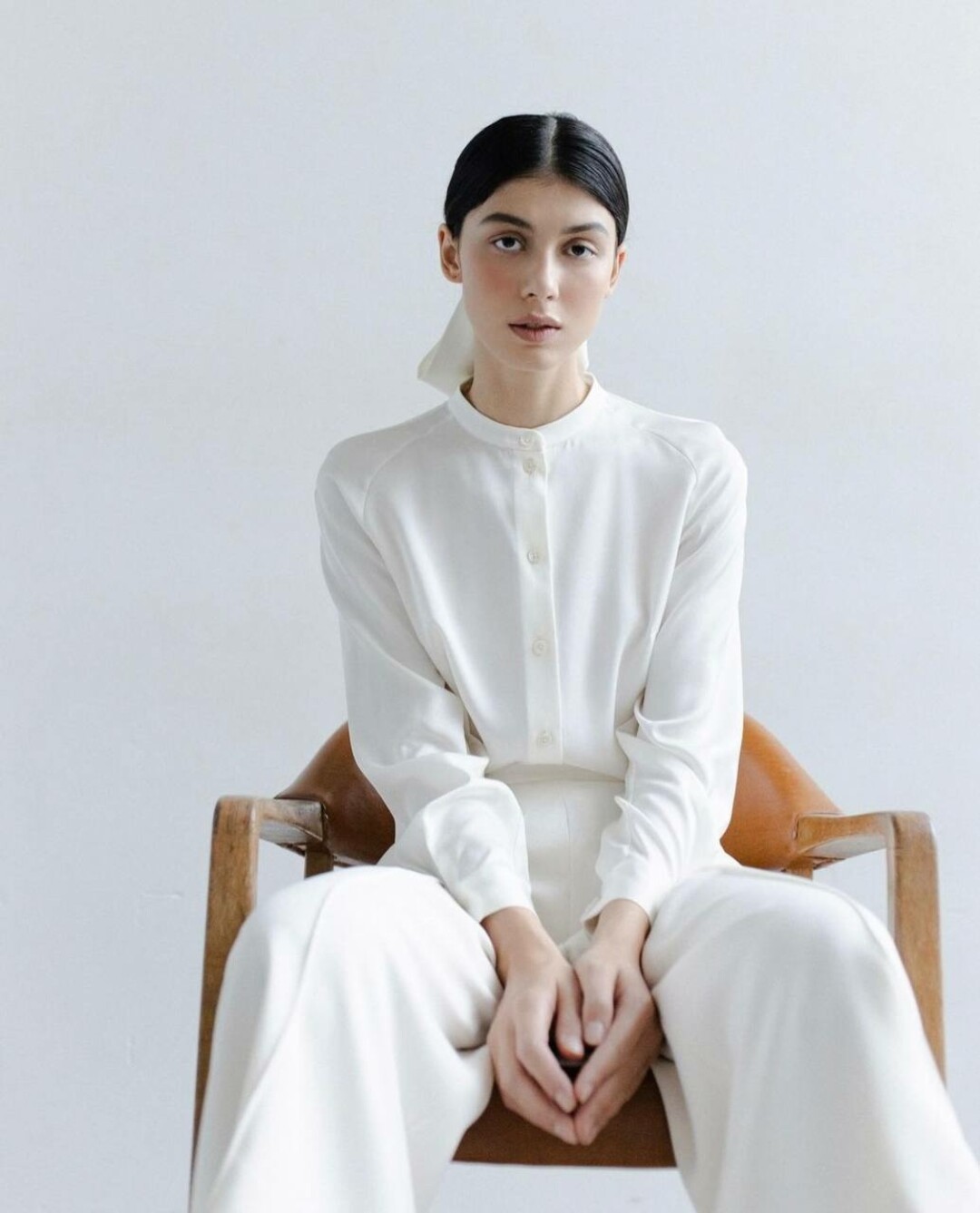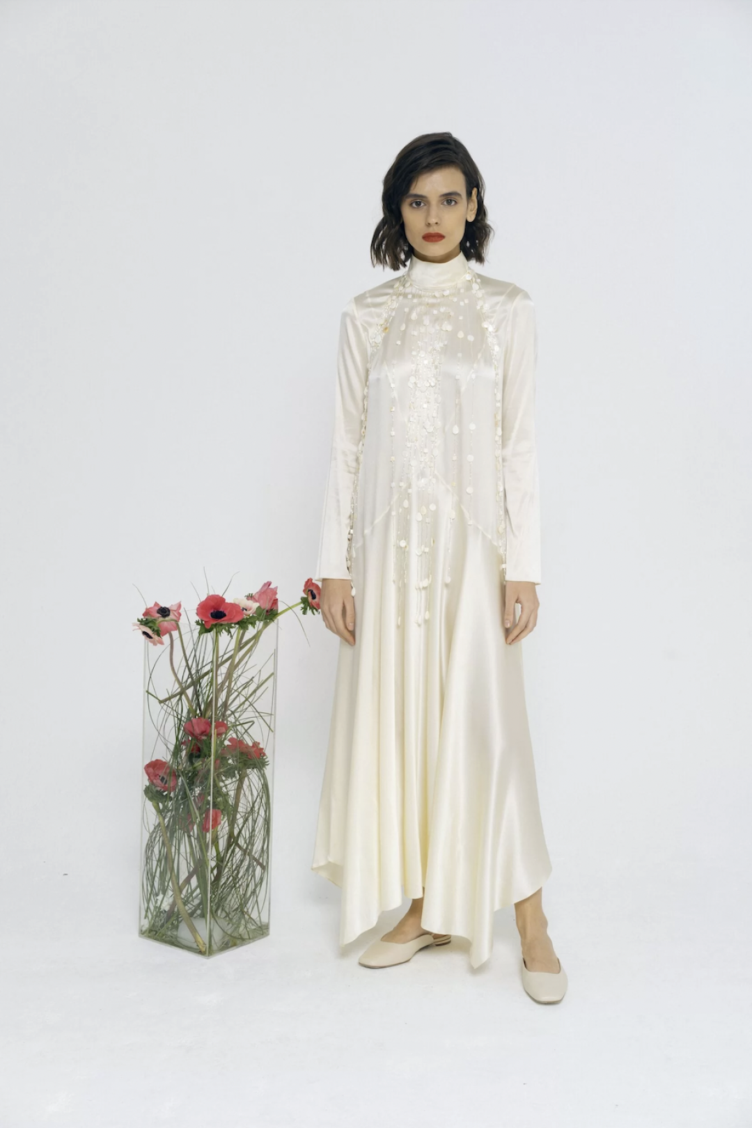 То самое платье можно найти и у тех брендов, которые не позиционируют себя как свадебные. Например, у Et Moi — марки победительницы нашего конкурса «Новые имена в моде» — 2021 Алены Шичкиной. Дизайнер изучает восприятие женщин в контексте истории с отсылками к разным эпохам и традициям и вшивает в феминные платья и блузы национальные культурные коды. В вещах Et Moi есть вполне себе свадебный потенциал. Рекомендуем присмотреться к миди и мини-платьям, плащу и пиджаку со складками на спине, свободным белым брюкам и длинному колье из японского бисера.