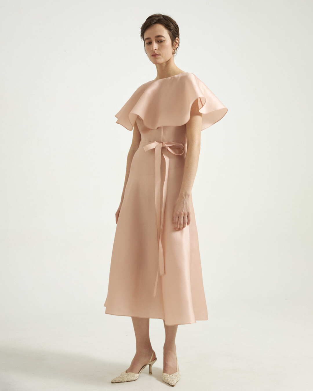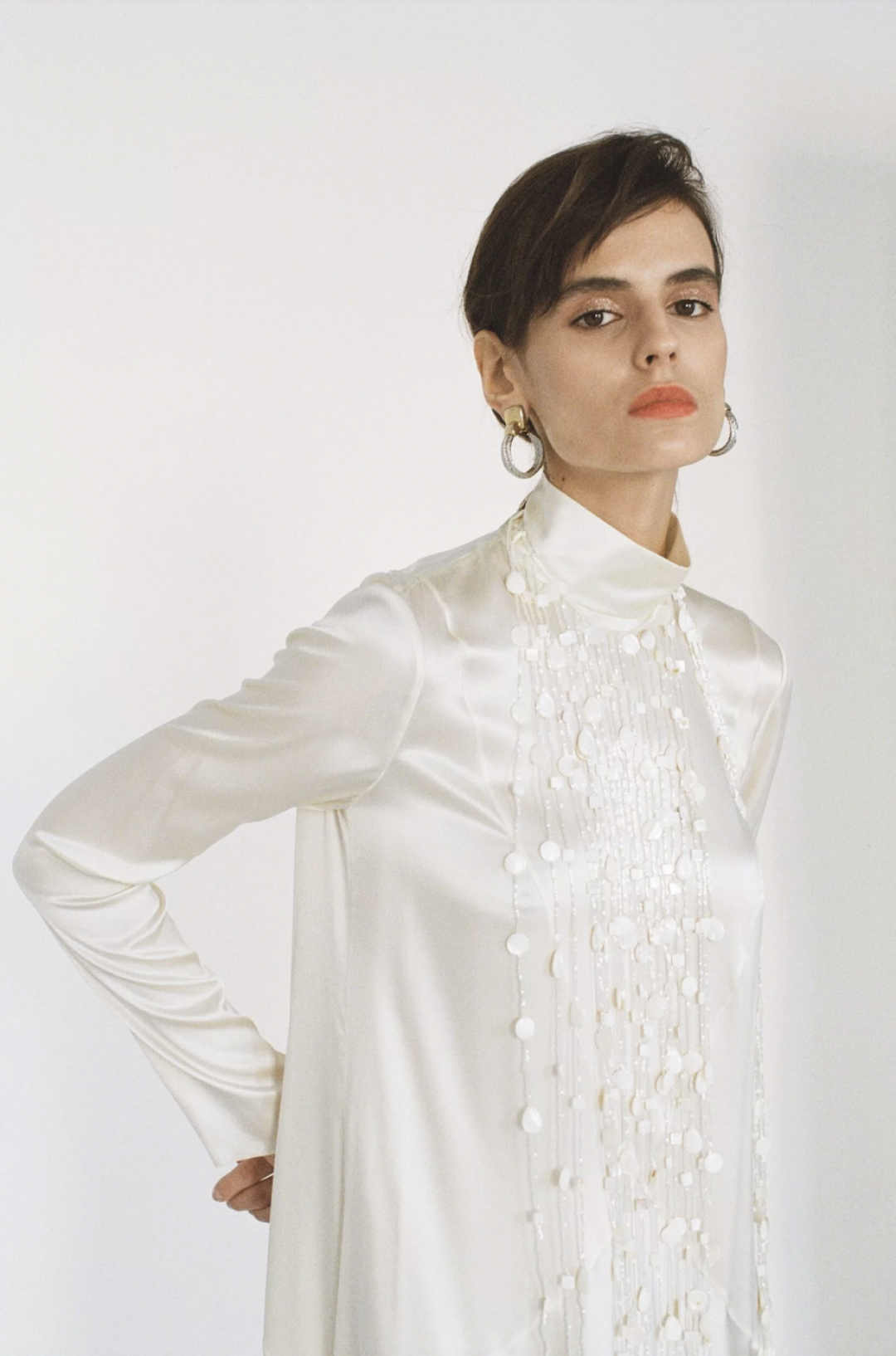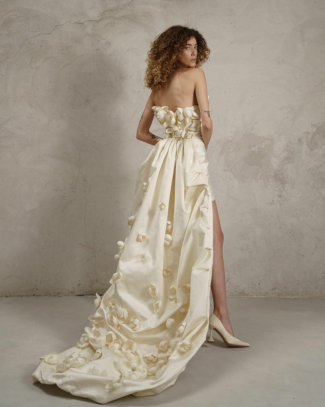 То самое платье можно найти и у тех брендов, которые не позиционируют себя как свадебные. Например, у Et Moi — марки победительницы нашего конкурса «Новые имена в моде» — 2021 Алены Шичкиной. Дизайнер изучает восприятие женщин в контексте истории с отсылками к разным эпохам и традициям и вшивает в феминные платья и блузы национальные культурные коды. В вещах Et Moi есть вполне себе свадебный потенциал. Рекомендуем присмотреться к миди и мини-платьям, плащу и пиджаку со складками на спине, свободным белым брюкам и длинному колье из японского бисера.