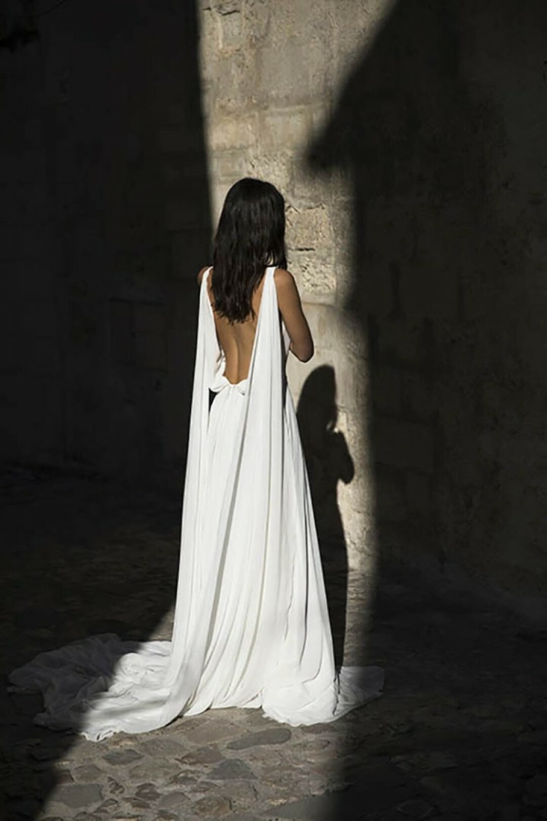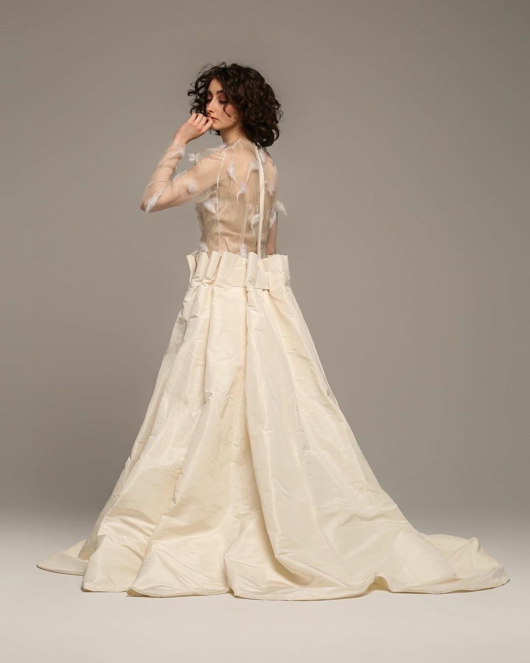 Никакого консерватизма и никаких условностей, зато максимум diversity. Vian создают свадебные платья для невест вне зависимости от их внешности, сексуальной ориентации и возраста. Марка позиционирует свои образы, как экстравагантные. Тут можно найти распашную и очень объемную юбку, шелковую рубаху, передник из репса, платье с огромными рукавами-фонариками (скорее даже фонорями!), платье-кейп, а еще фату, расшитую бахромой или перьями. И это очень красиво! Бонус: у невесты есть возможность вышить на платье значимое для нее слово, фразу или знак.