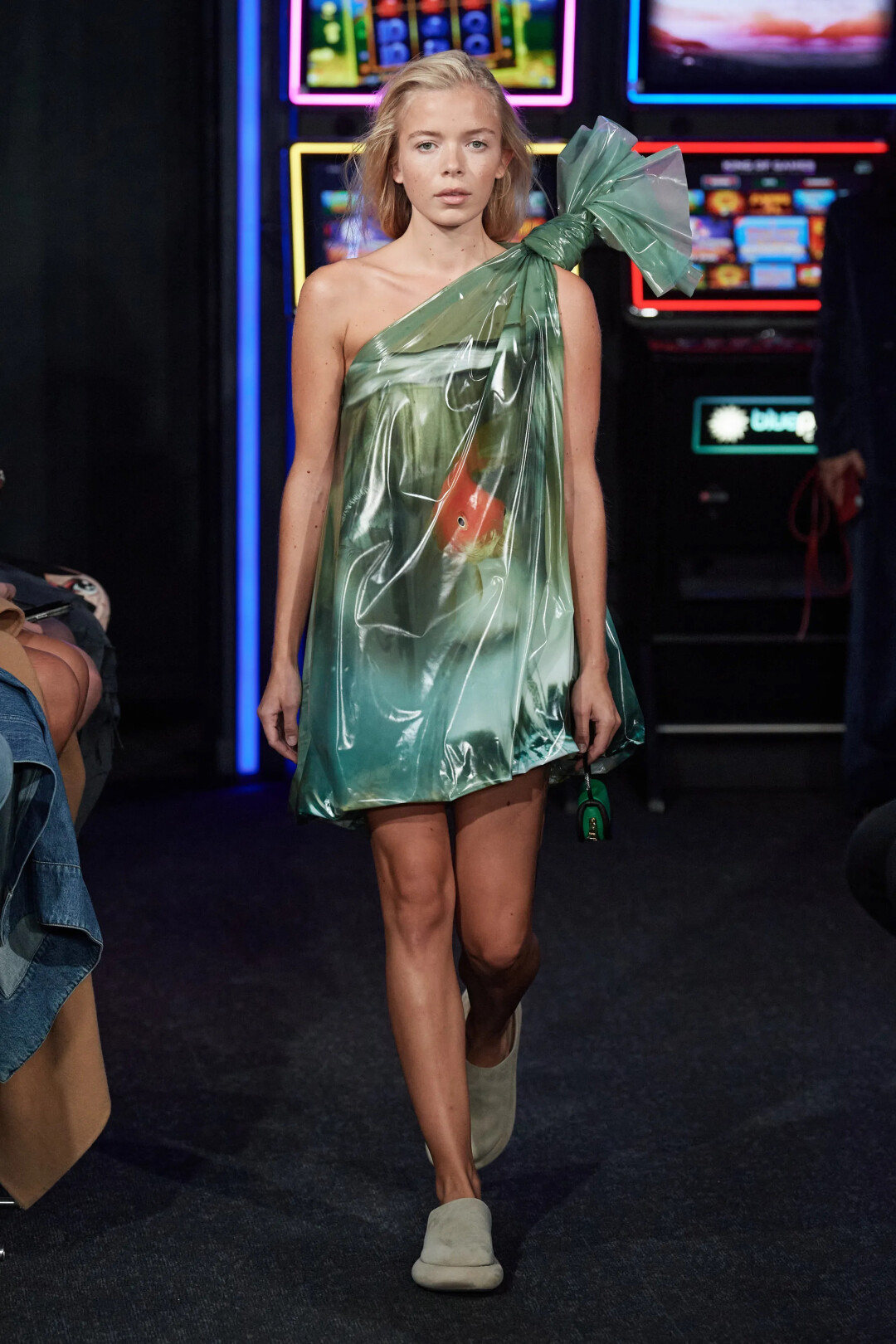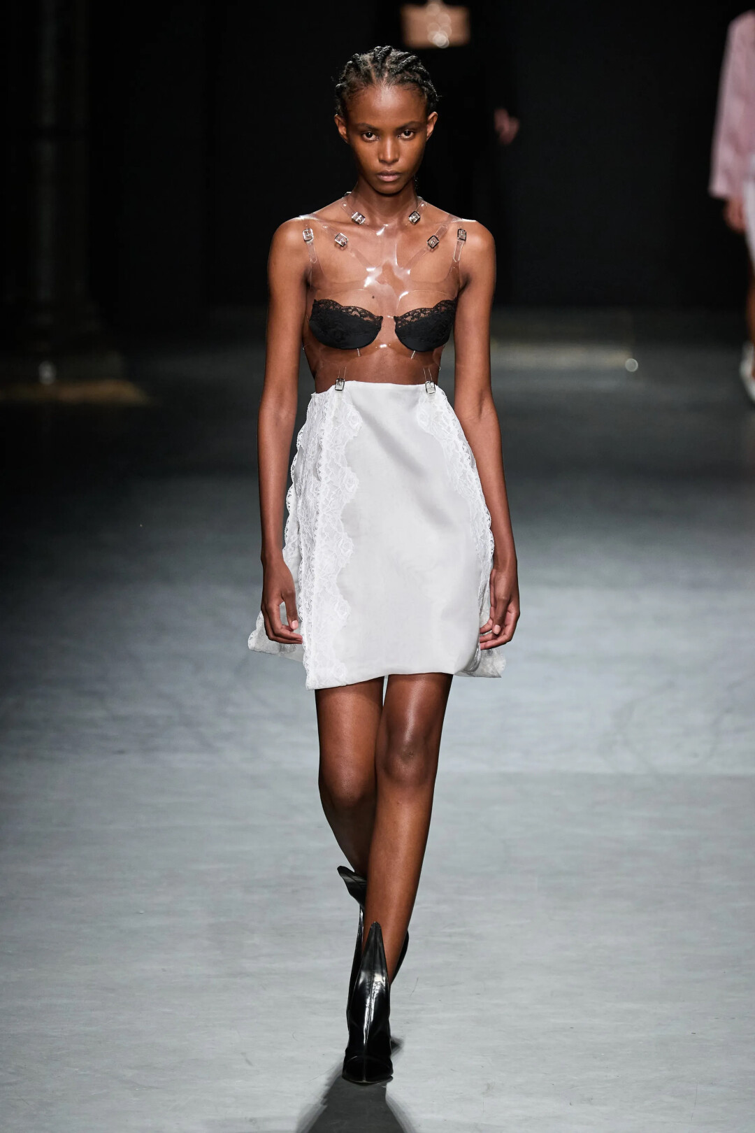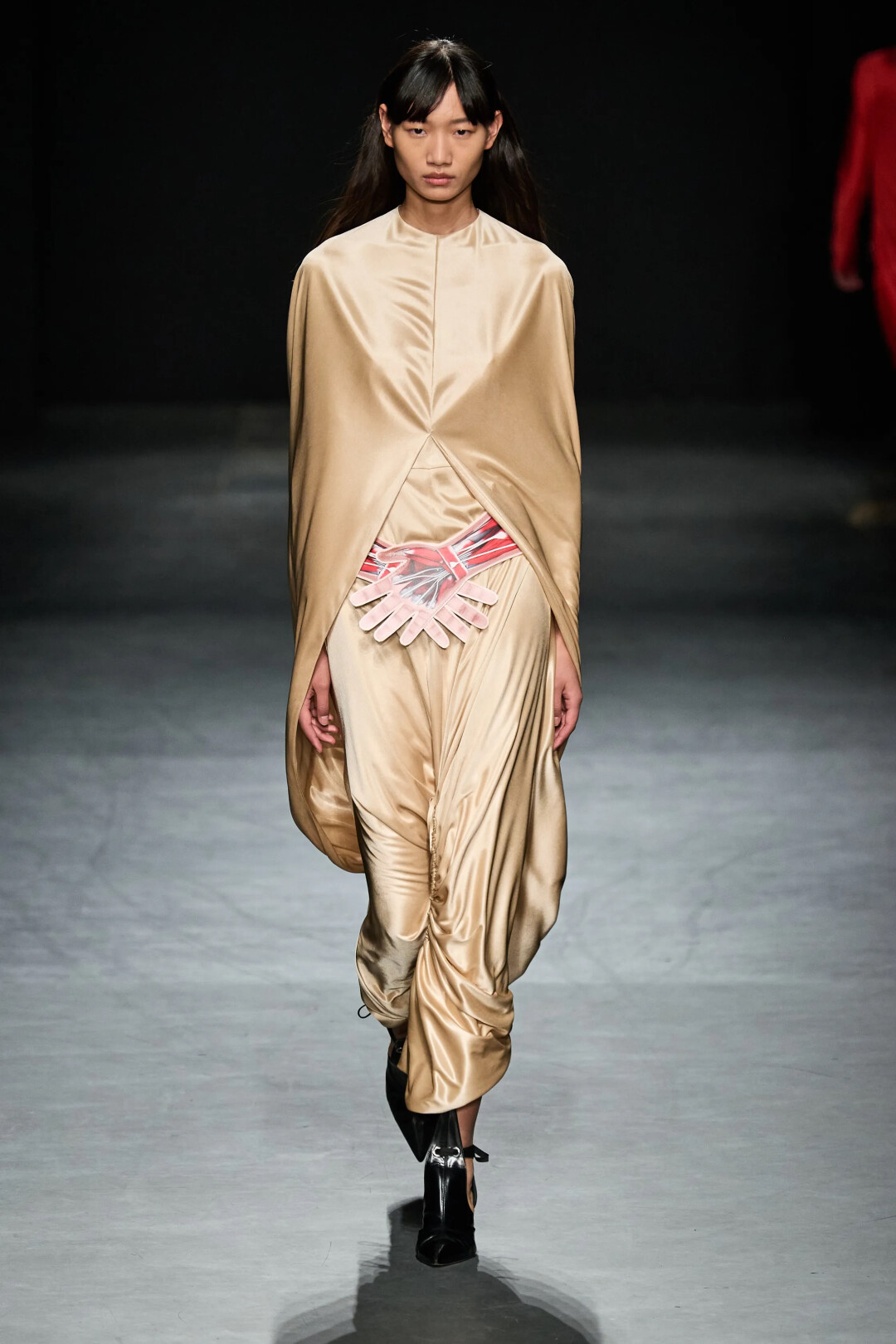 Вместо музыки на показе Кристофера Кейна передавали урок анатомии. Из динамиков лилось: «Я расчленяю женщину. В лучшем виде! В хорошем смысле!». Как тут не встрепенуться петербургскому сердцу. Так из чего же сделаны наши девчонки? Из шелков, кружев, а также рук и целлофановых пакетов, конечно.