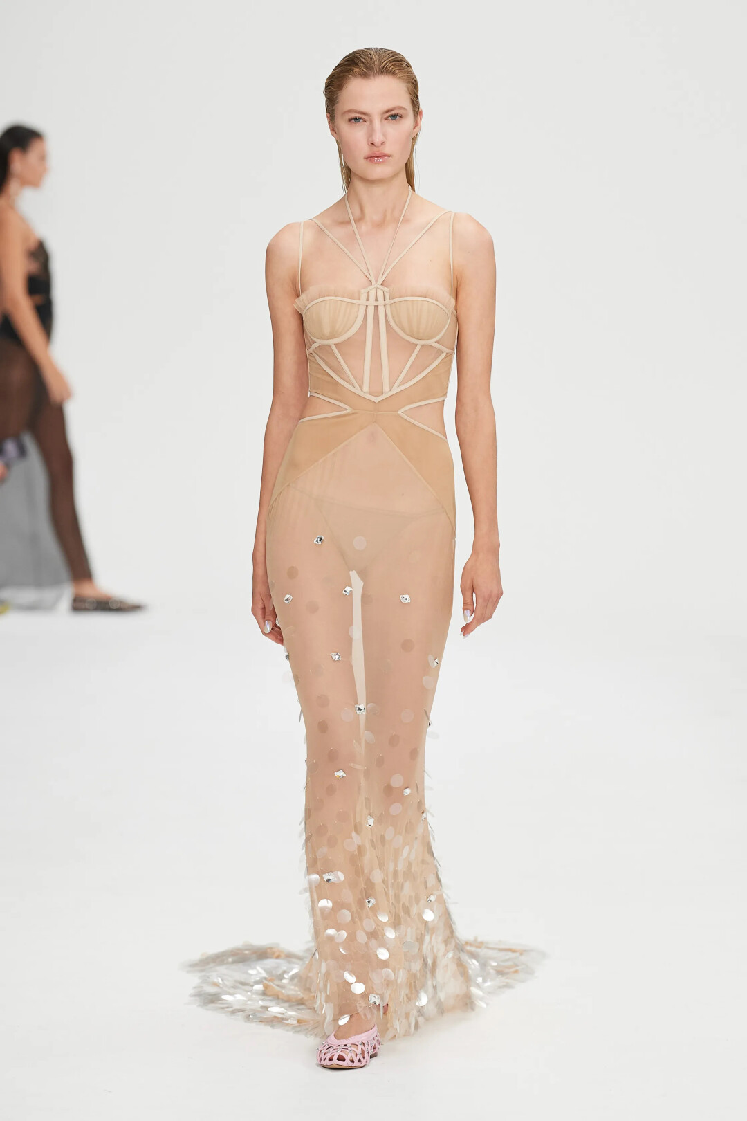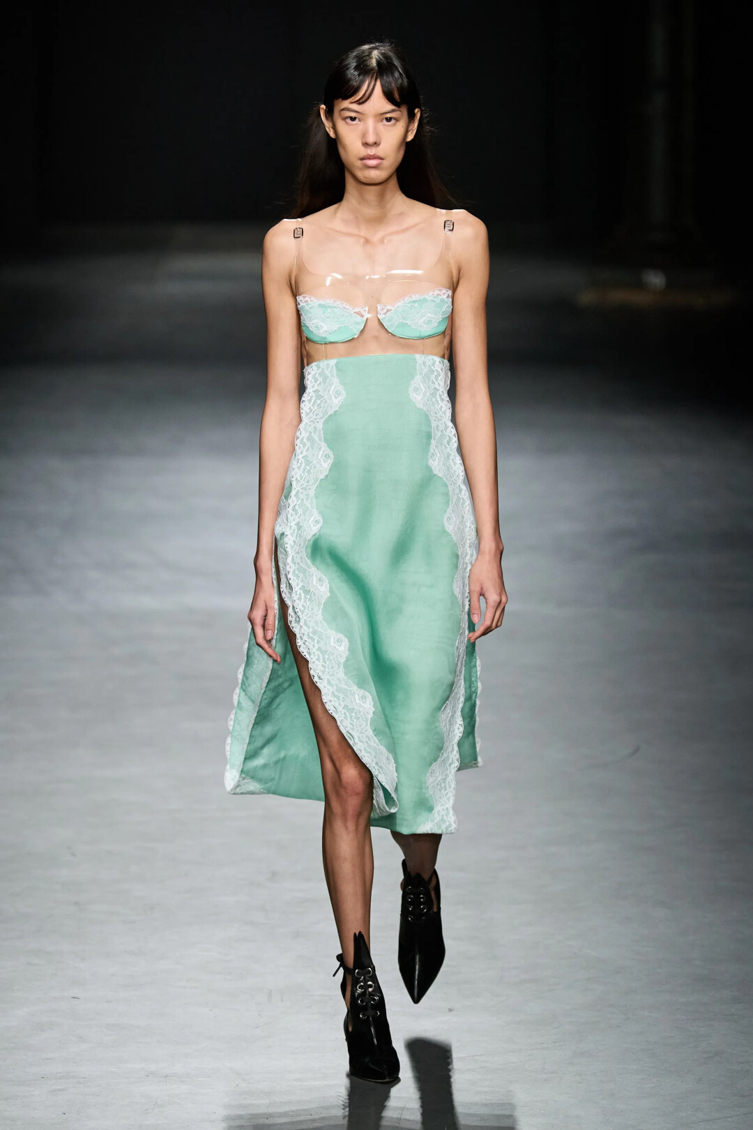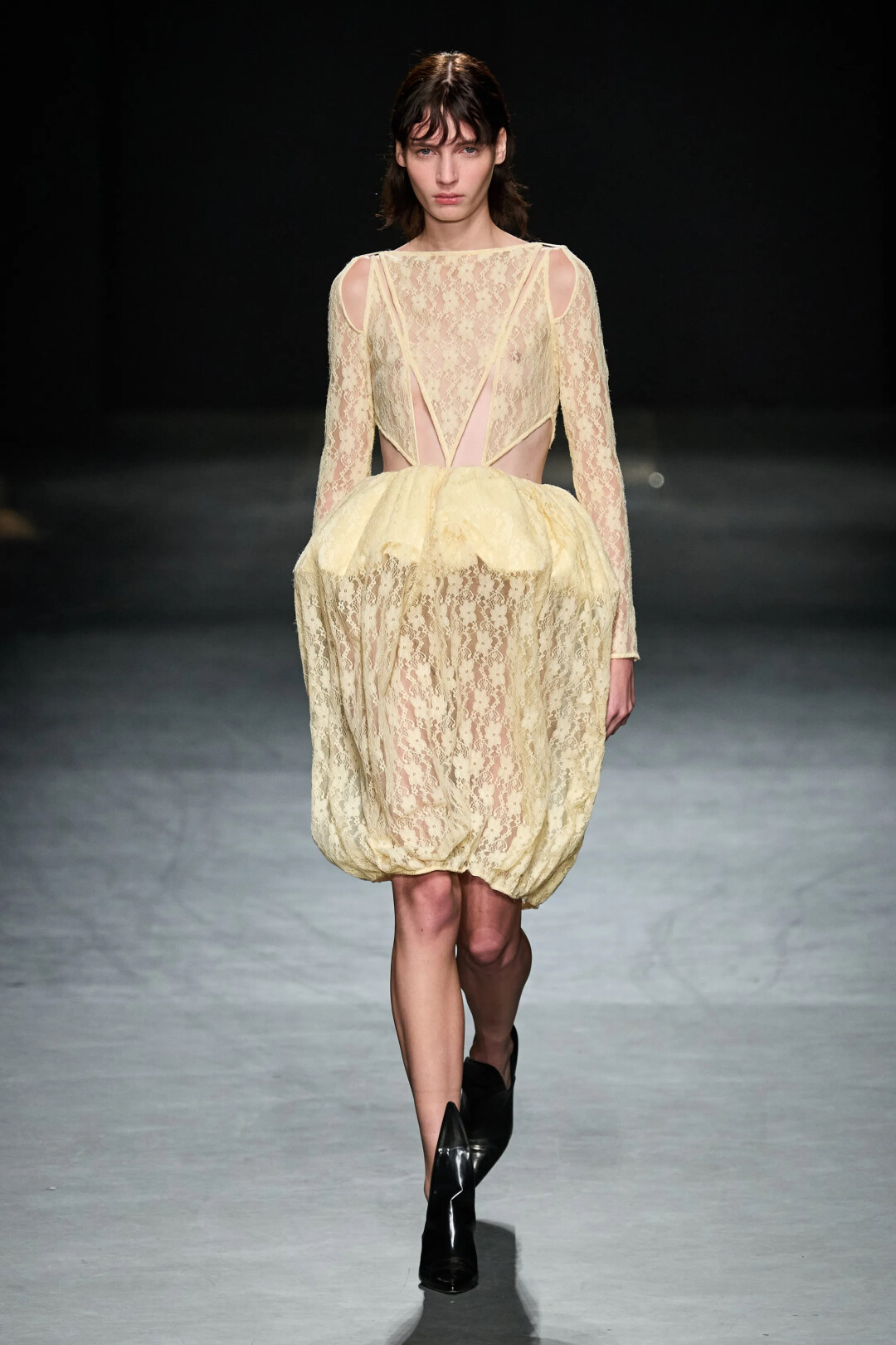 Вместо музыки на показе Кристофера Кейна передавали урок анатомии. Из динамиков лилось: «Я расчленяю женщину. В лучшем виде! В хорошем смысле!». Как тут не встрепенуться петербургскому сердцу. Так из чего же сделаны наши девчонки? Из шелков, кружев, а также рук и целлофановых пакетов, конечно.