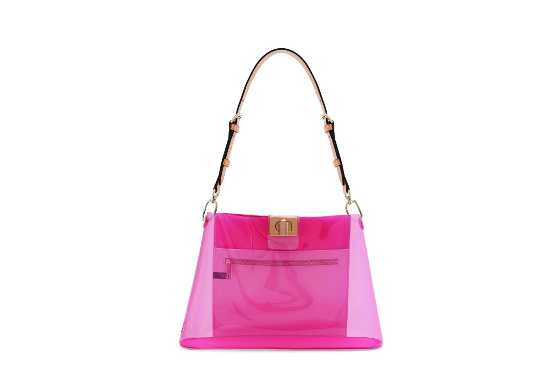 Сумка из винила — еще один способ отработать тренд на прозрачное, а если она конфетно-розовая, то еще и на Y2K. Именно такая фэшн-шалость есть в коллекции Furla: вместительная, инфантильная и ничего не скрывающая.