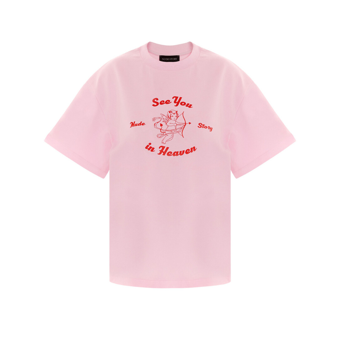 Принт на нежно-розовой футболке из итальянского хлопка красноречиво намекает, что ее хозяйка открыла сезон охоты на сердца.