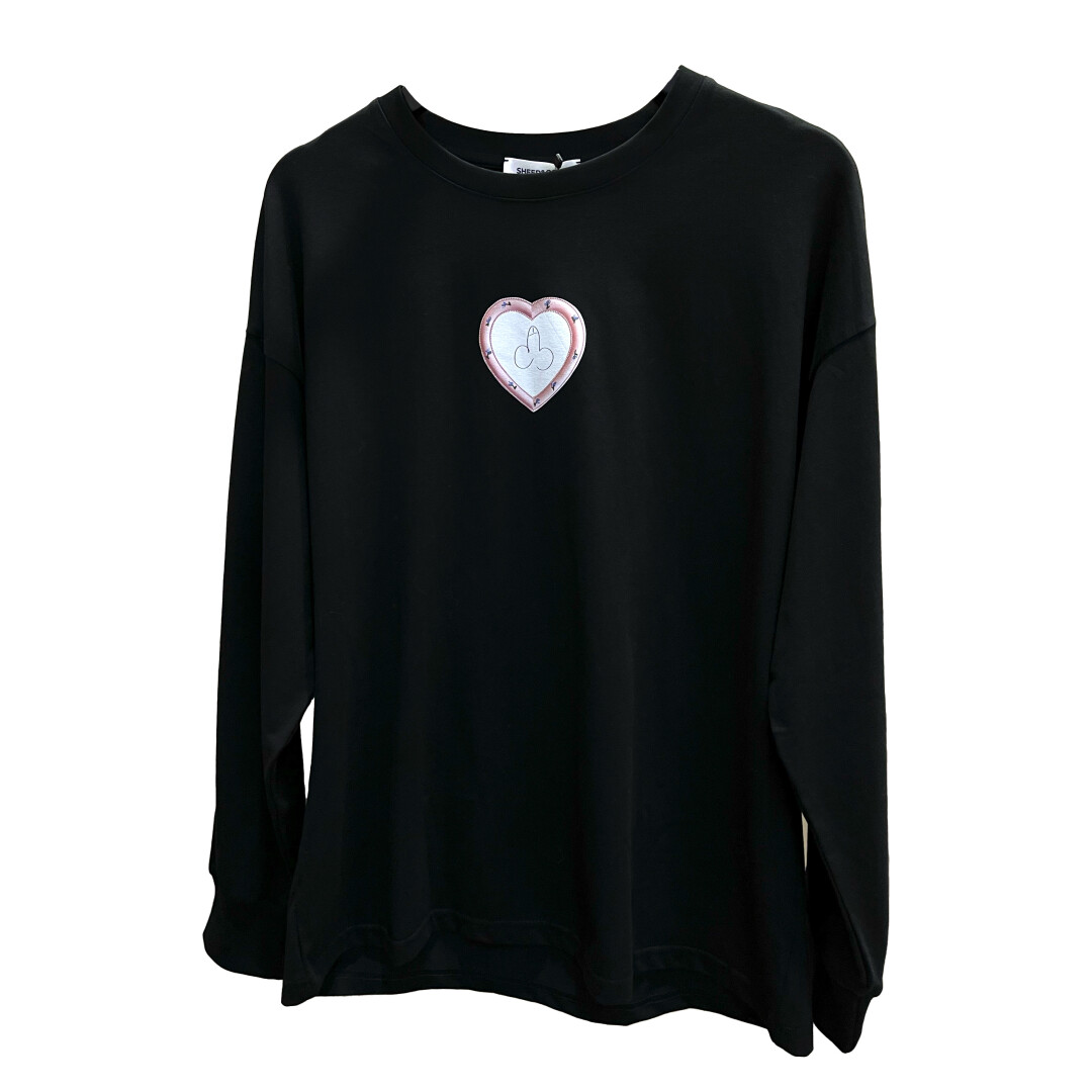 Для всех, кто ценит личные границы и хорошее настроение, нашли на полках шоу-рума «Помещение» лонгслив с сердечком, на котором небрежно нарисовано направление движения для всех неприятных людей.