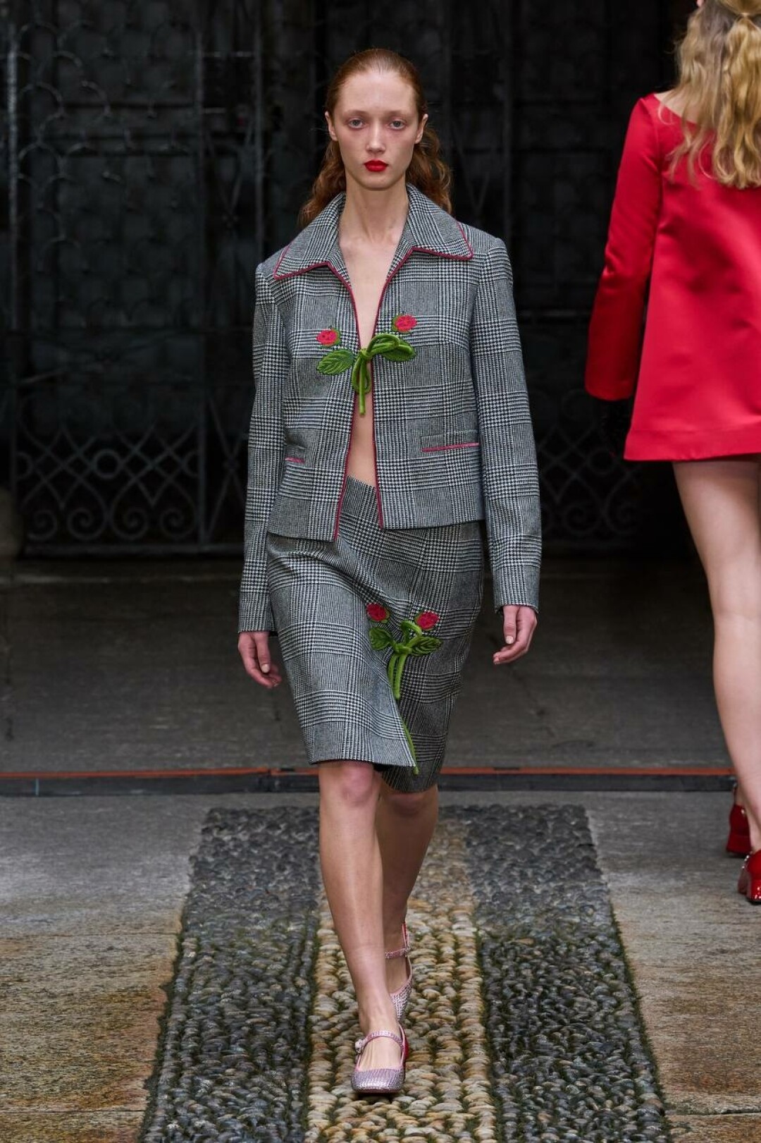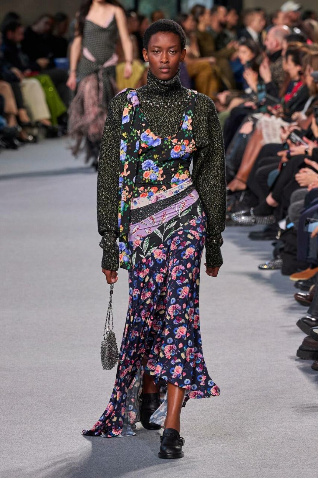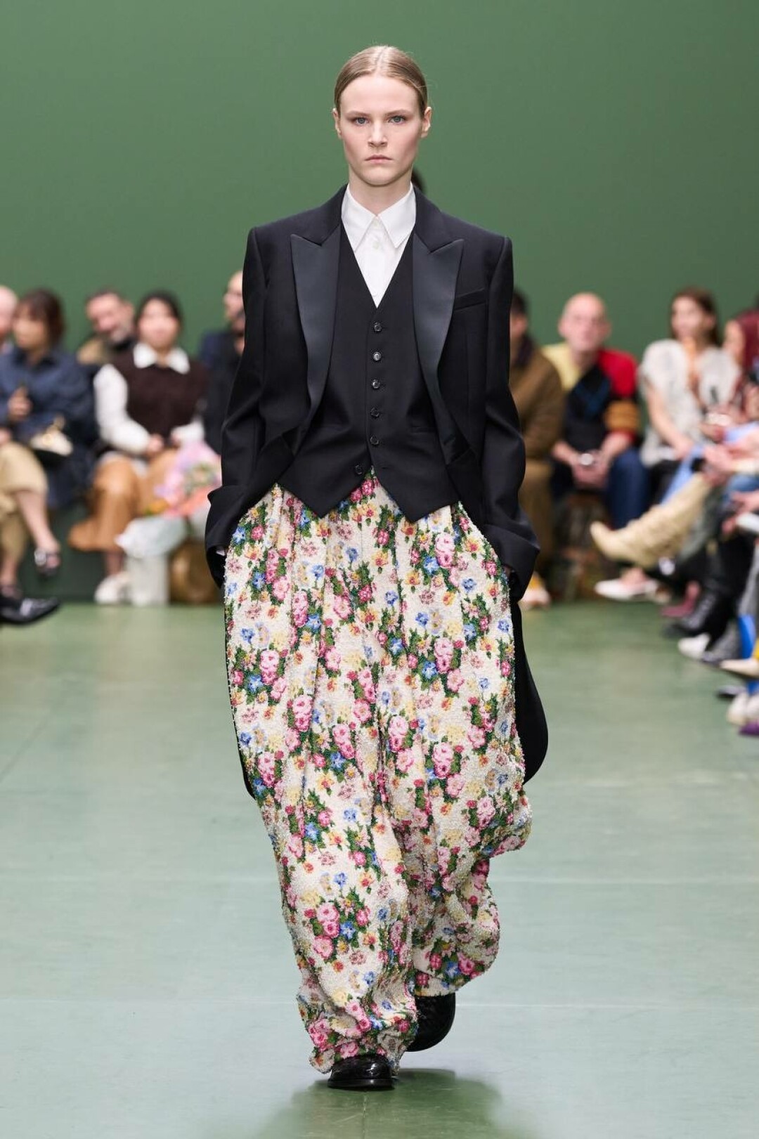 В Miu Miu и Loewe голосуют за эклектику — Миучча Прада стилизует пышную юбку с уорхоловскими цветами с рабочей курткой, объемным свитером и маскулинными ботинками на шнуровке, а Джонатан Андерсон с помощью парашютов с микро-бутонами избавляет от излишней серьезности вечерний смокинг (записываем трюк для предновогодних вечеринок и корпоративов!).