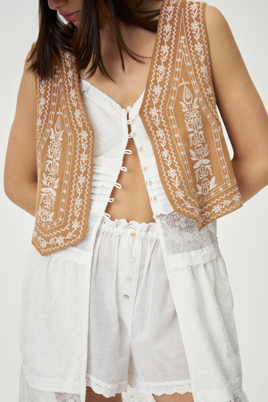 Пока Чемена Камали из Chloe громко возрождала бахрому и кружево, худрук Masterpeace Евгения Линович скромно курсировала по всему миру в поиске лучших тканей и уникальных мастеров-рукодельников. Результатом трехлетнего (!) фэшн-испытания стала артизанальная коллекция «Бохо», материалы для которой креативный директор разыскивала на крошечных европейских фабриках и выставках. Органически выкрашенный хлопок и лен с греческих островов, французский батист и испанское кружево превратились в пончо, сплетенное как ибицианская рыбацкая сеть, вязаные пэчворк-сеты из мини-юбки и топа, жилеты с бахромой и этническим орнаментом, полупрозрачные макси-платья с вышитыми рунами.