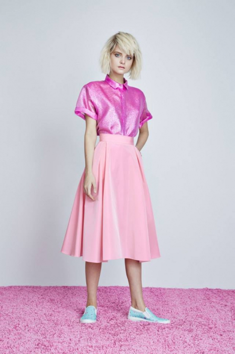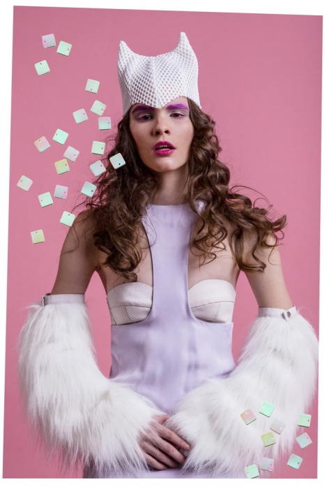 Сестры Вайпер, победители нашего конкурса «Новые имена в дизайне» зарекомендовали свою марку как ту, которой удается делать почти театральные наряды. Катя и Вера продолжают работать на этом поприще: героиня новой коллекции — девушка из комиксов, воин жвачки (Bubblegum warrior). Образы ее воинственны, но не агрессивны — платья из неопрена, кожаные гетры, вышитые черные сюрикэны и шапки, которые напоминают шлемы. Вместе с ними соседствуют и очень женственные вещи — пальто нежных цветов из искусственного меха, мини-юбки и белоснежные кожаные топы.