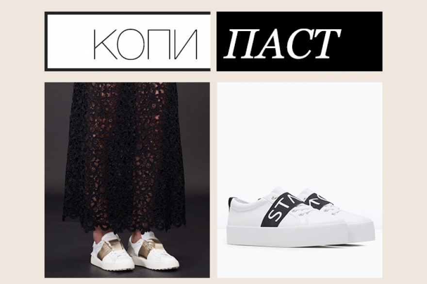 Обувь-default весенних коллекций — простые белые кроссовки. В лукбуке Valentino дизайнеры Мария Грация Кьюри и Пьер Паоло Пиччоли сочетают их как с широкими брюками из семидесятых, так и с кружевными, почти кутюрными, платьями в пол. Экспансию белых кроссовок в повседневный гардероб можно начать с похожей копии Zara — с надписями «Start» и «Stop» на правой и левой соответственно.