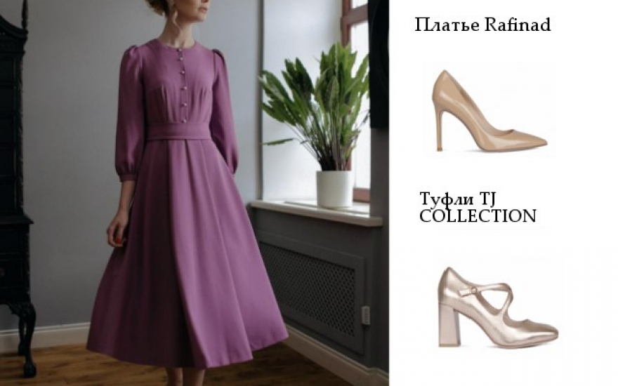 И… снова платье! На этот раз фиолетового цвета, цвет 2018 года, между прочим), приталенное, длины миди, с жемчужными пуговицами. На сайте компании написано, что поводом надеть такое платье может быть свидание. Мы согласны и на свидание, и в театр, и в ресторан, и куда угодно лишь бы с любимым и в этом платье. Можно только в этом платье. Шутка (или нет).