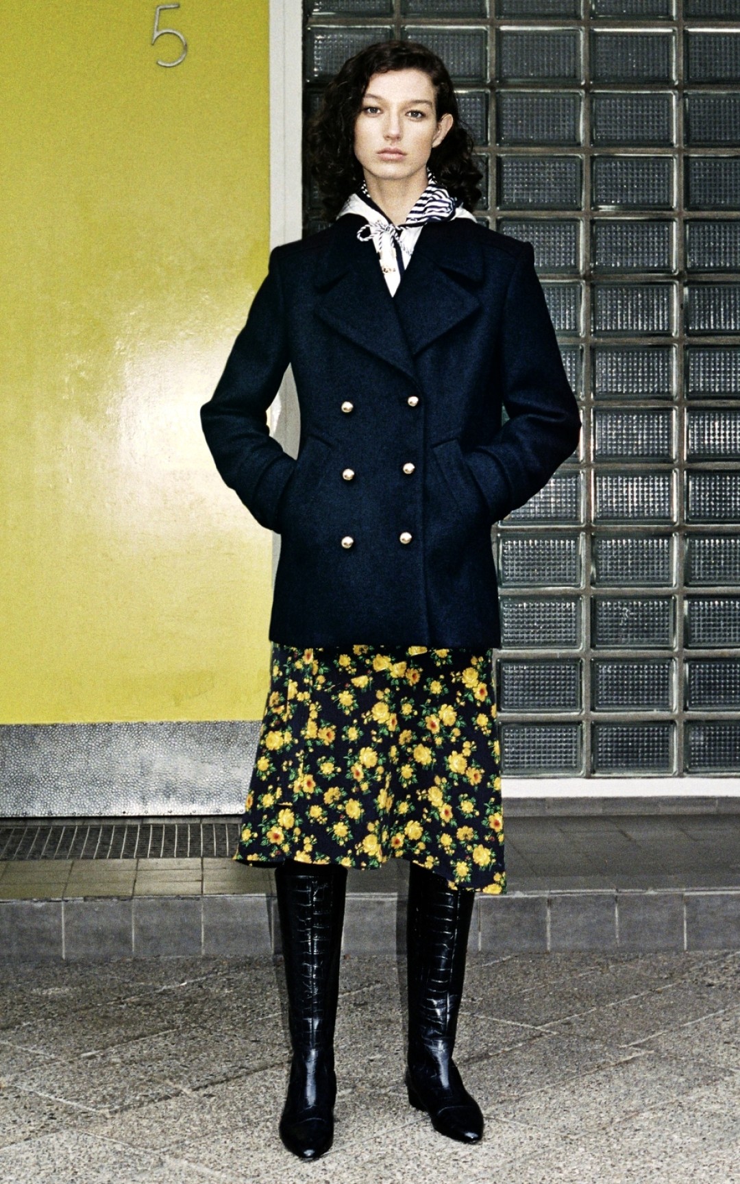 Бушлаты с золотыми пуговицами носим вовсе не с джинсами, а с платьями в принте из пушистеньких купальниц. Именно так выглядит новый урбан-фэшн по версии Claudie Pierlot. (Au Pont Rouge)