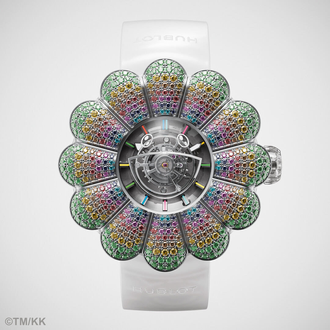 Он такой один — центральный турбийон под смайлом, выгравированным лазером на сапфировом «куполе» Hublot Takashi Murakami Tourbillon Only Watch. Уникальные часы в окладе из 12 лепестков с 444 драгоценными камнями созданы для продажи на аукционе: средства от их реализации пойдут на поиск лечения миодистрофии Дюшенна. У новых Hublot и правда большое сердце! В том числе чисто анатомически: два заводных барабана обеспечивают механизму с ручным подзаводом почти недельный запас хода.