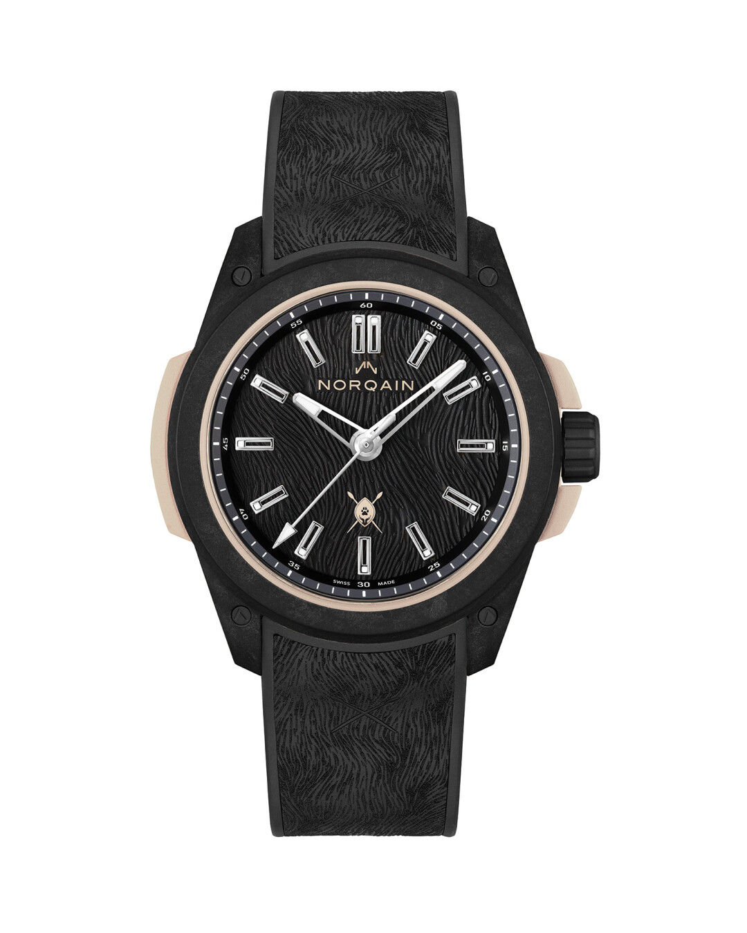 Дико крутые часы выпустили на волю (и в магазины AllTime) швейцарцы Norqain. Для серии трехстрелочников Independence Wild One молодые часовщики (бренд появился в 2018-м!) запатентовали собственный композитный карбон Norteq — в шесть раз легче стали, в три с половиной раза легче титана. А еще инженеры компании придумали и разработали противоударную конструкцию корпуса с амортизаторами, готовыми выдержать съезд с Эльбруса на велосипеде или дружеские панчи со львом. Последнее ежедневно практикует натуралист Дин Шнайдер, который основал в ЮАР заповедник для львов и гиен Hakuna Mipaka. Песок оттуда вживлен в корпус 500 часов ограниченной серии, а на циферблате и каучуковом ремне отпечатался узор львиной шерсти.