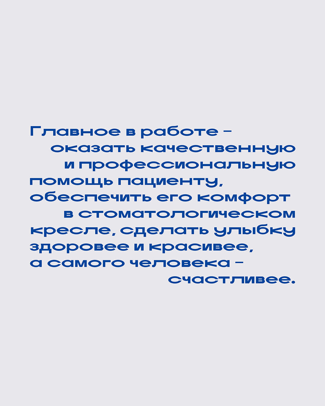 Главное в работе – оказать качественную и профессиональную помощь пациенту, обеспечить его комфорт в стоматологическом кресле, сделать улыбку здоровее и красивее, а самого человека – счастливее. Ведь именно улыбка – один из определяющих факторов качества жизни человека.
