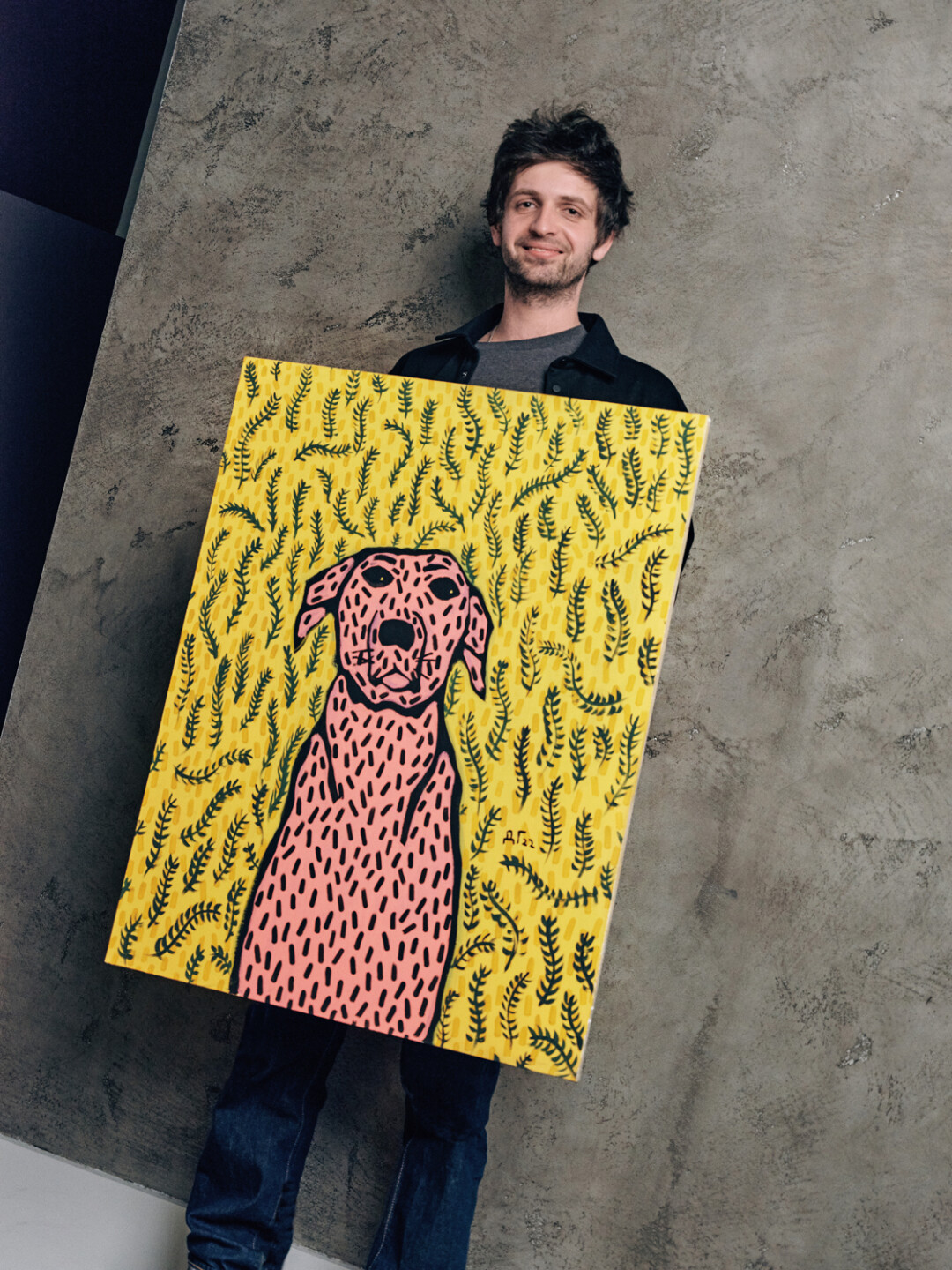 Художник, который подписывается ДГ, использует для рисования строительными красками на основе акрила любые плоскости — доски, фанеру, куски мебели, холсты, картон. Работы ДГ есть в коллекциях Ксении Чилингаровой и Андрея Бартенева.