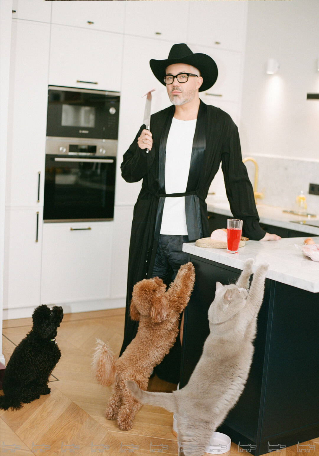 Самый мелкий, черный пес, — это Тимофей. У Тимы характер жизнелюбивого раздолбая. Кот и Юра максимально деликатны к интерьеру: ничто не было поцарапано, ни один ковер не затянут. Тима покусал уже все, что мог, обжился максимально. Он младший и, мне кажется, так привлекает к себе внимание: первый прибежит, первый тебя оближет, обоссыт и первый обглодает кресло. Что интересно, все трое домочадцев — петербуржцы!