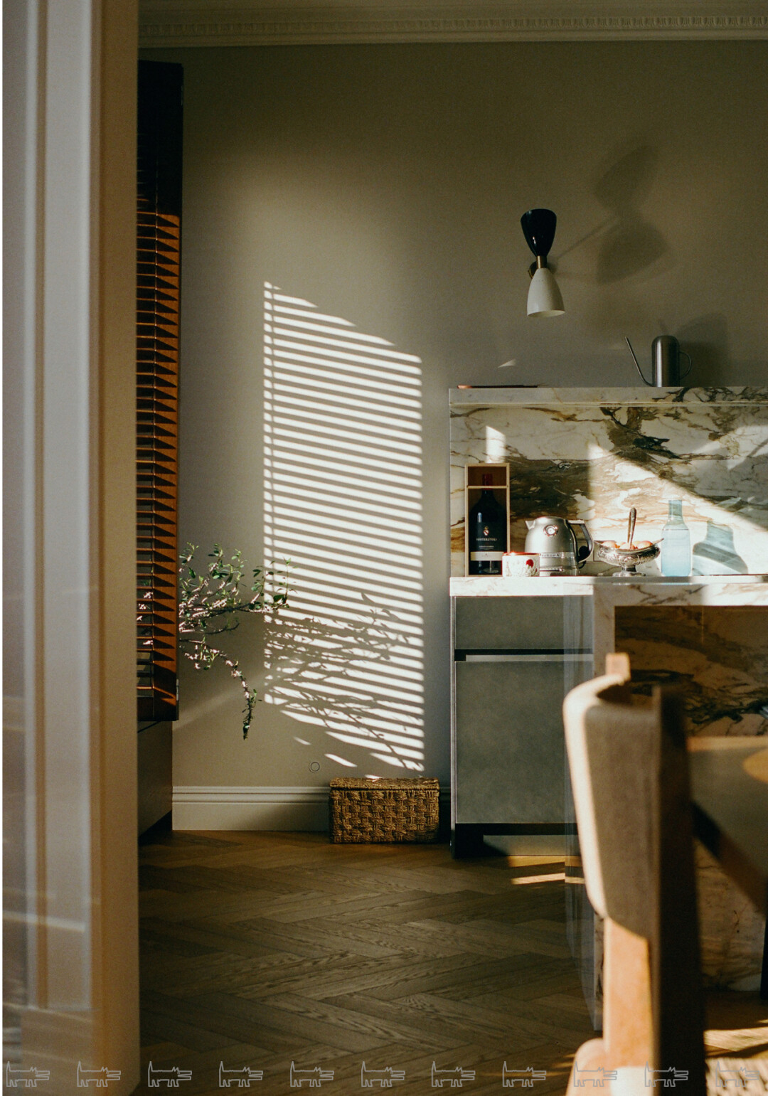 С утра квартиру заливает солнечный свет — деревянные жалюзи сделала на заказ компания Archiwood
