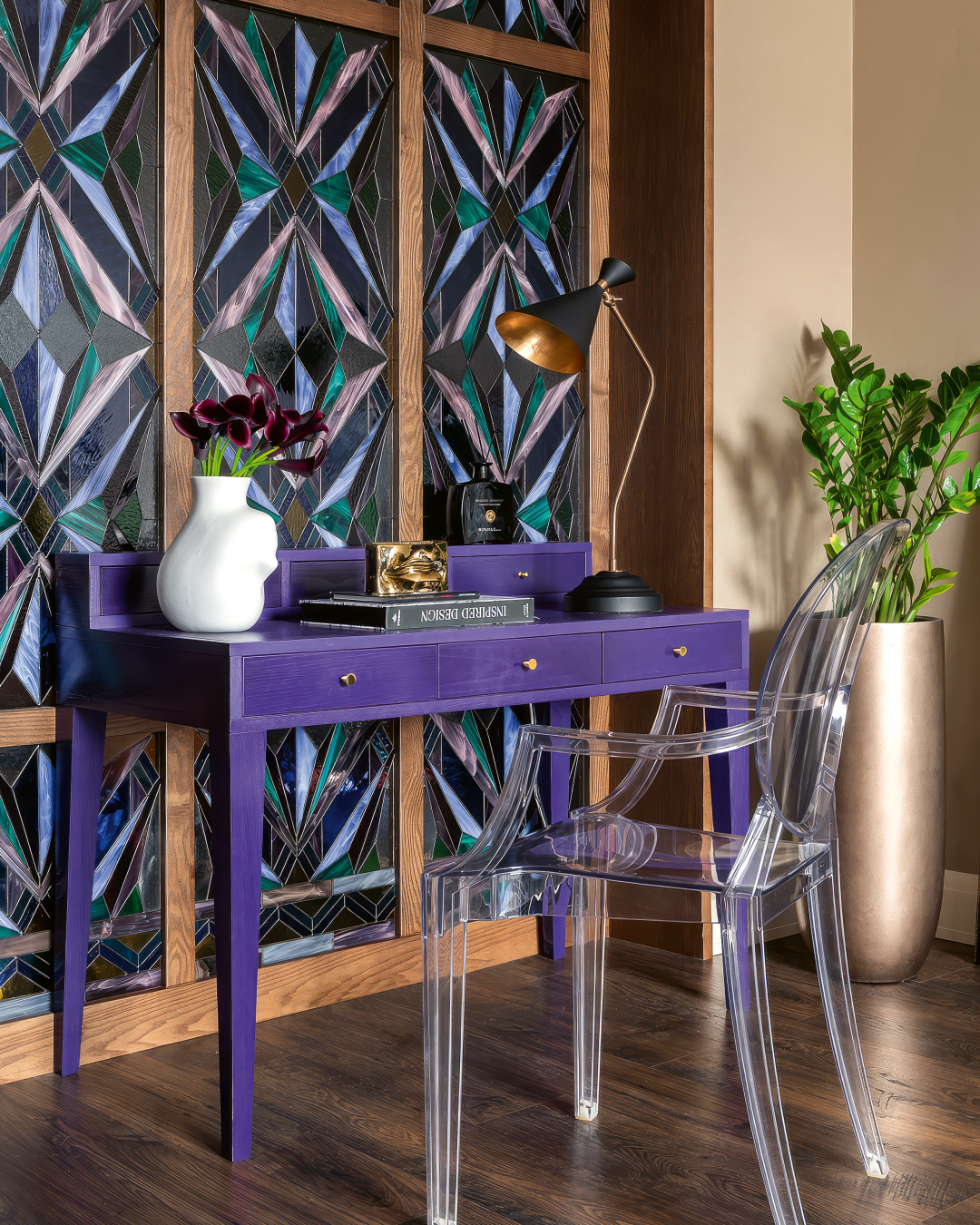 С такими интерьерами всегда дико интересно работать, мотаться по мастерским и вместе с ремесленниками создавать прекрасные вещи. Название этого проекта возникло сразу: мы назвали его «Драгоценная шкатулка». Имя прекрасно подошло и определило концепцию работы: в каждой комнате появлялось что-то дорогое и роскошное, от чего мы начинали «танцевать». В спальне все началось с обоев в изголовье с малахитовыми медальонами. В ванной мы использовали мрамор. В кухне появилось панно с гигантскими цветами, а обрамили мы его бархатной лентой. Чтобы получилось невероятной красоты перегородка между прихожей и гостиной, мы долго изобретали витраж: до сих пор помню, как приходила в мастерскую в старом городе, перебирала цветные стекла и создавала из них рисунок.
