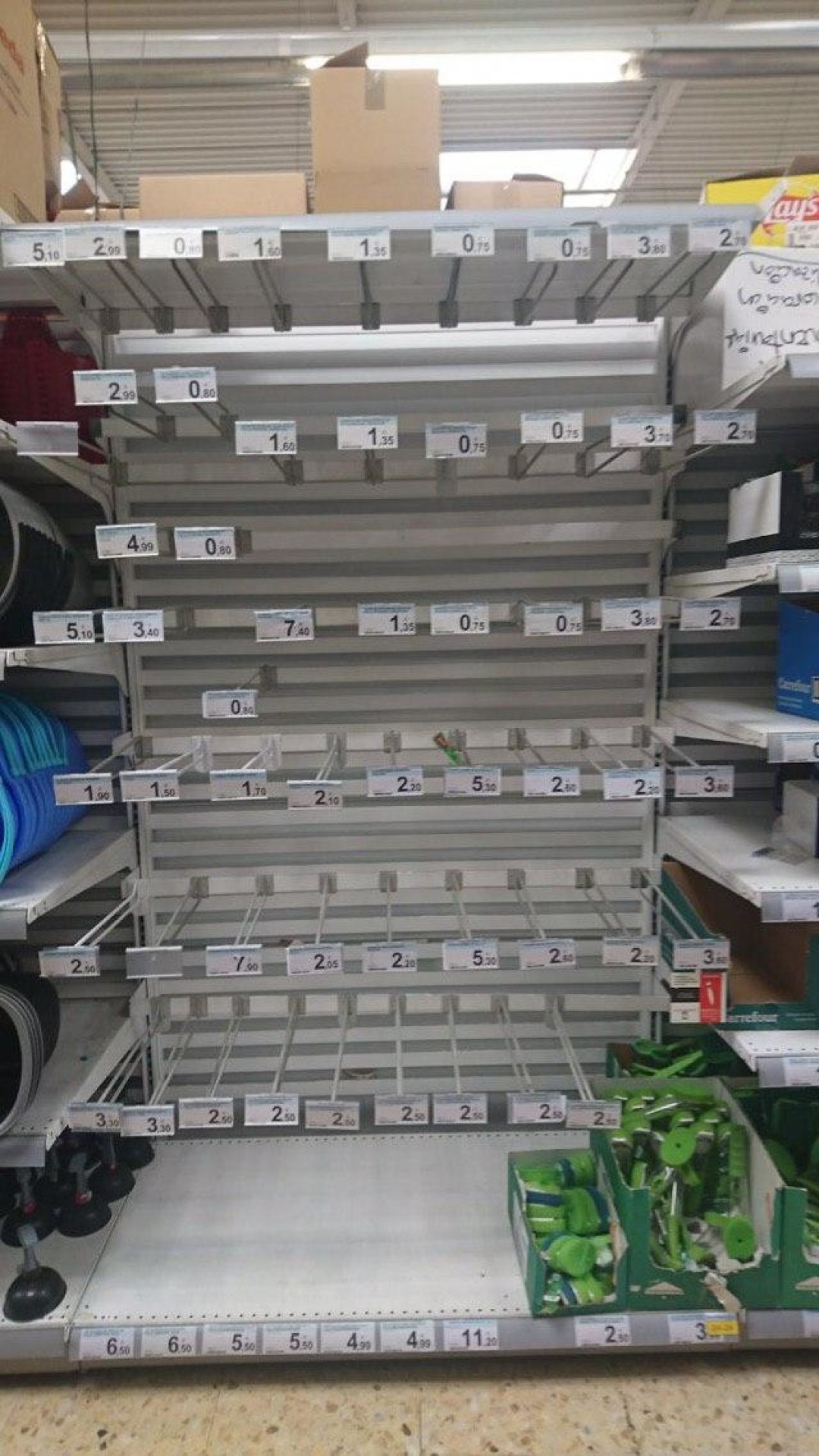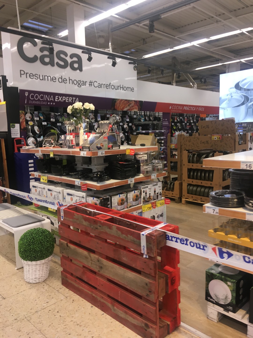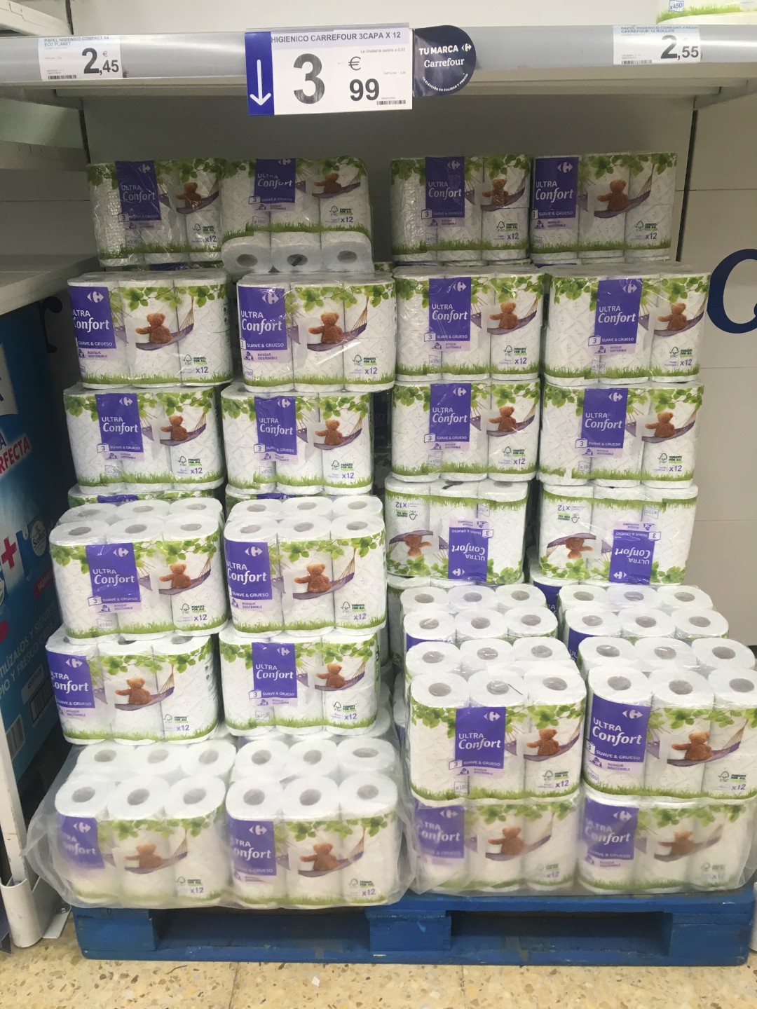 Как и везде, в первую очередь исчезла туалетная бумага. Это я заметила еще днем 13 марта, когда заходила в магазин у дома. Вечером же, заехав в «Меркадону» (супермаркет крупной испанской сети), мы увидели только пустые полки и шокированный персонал: все скупили молниеносно, за несколько часов. Впрочем, сотрудники магазина нас заверили: на складах всего полно и завтра же витрины снова будут ломиться от продуктов. Они оказались правы: в субботу в гипермаркете Carrefour было почти как обычно, и это притом что мы заехали поздно вечером.