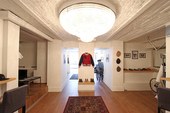 Капитальный ремонт новые владельцы не делали, поэтому на запуск магазина ушел всего месяц. Значительную часть интерьера составляют огромные зеркала, массивная хрустальная люстра и белые стены. Брутальная эстетика марки Syndicate отражается в деталях: одежду размещена на замысловатых вешалках из труб и фактурных деревянных полках.
