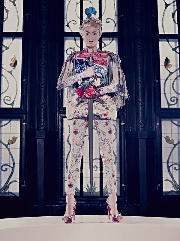 На Оксане: платье MARY KATRANTZOU FOR TOPSHOP, жакет MAISON MARTIN MARGIEL A ARTISАNAL (MAISON MARTIN MARGIEL A ) , комбинезон LES (LIL AC-AND-BEIGE.BLOGSPOT.COM), туфли CHRISTIAN LOUBOUTIN (CHRISTIAN LOUBOUTIN), тиара и колье TOPSHOP (TOPSHOP), цветочная тиара «*ЛОСИ.ЛОСИ» (VK.COM/CLUB17067891), меч «ТЕАТР МИСТЕРИЙ ЕВГЕНИИ ЕЛОВИКОВОЙ», цветы «ЦВЕТЫ ДЛЯ КРАСОТЫ» (VK.COM/CLUB21718378) благодарим бар-клуб «ШЕХТЕЛЬ» (МОСКВА, ТВЕРСКОЙ БУЛЬВАР, 18 , СТР. 1, ТЕЛ . ( 4 9 5 ) 6 2 9 - 1150) —  за предоставленные для сьемки помещения, «ТЕАТР МИСТЕРИЙ ЕВГЕНИИ ЕЛОВИКОВОЙ» (WWW.MYSTERIES.RU) — за реквизит