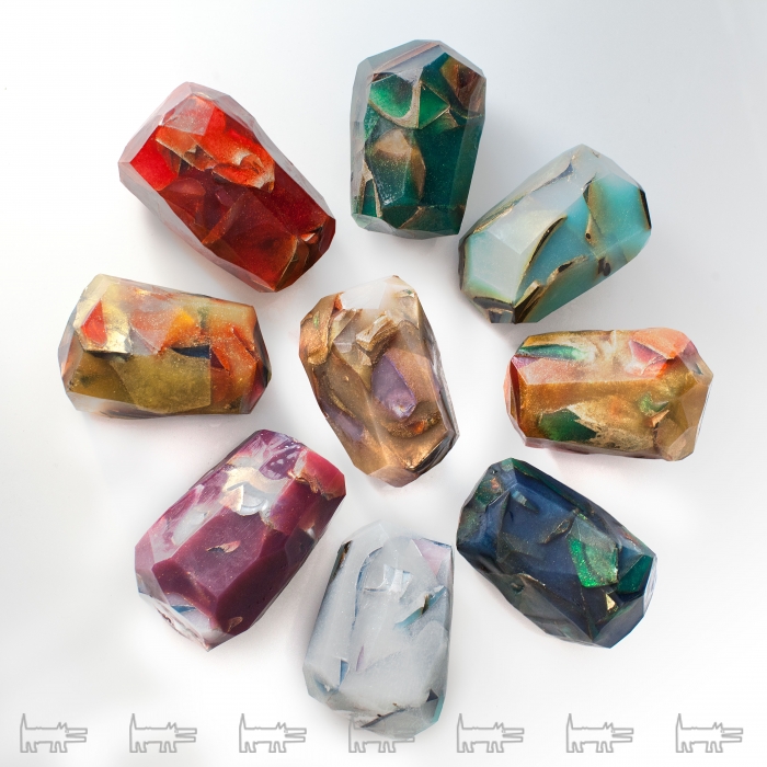 По форме мыло Rocks приближено к обработанному природному камню и сохраняет благородный вид до конца использования. Да и внутри каждого бруска – кулон из полудрагоценного камня: горного хрусталя, яшмы, аметиста, розового кварца, перламутра, агата и других. Подобрать его, так же как и композицию эфирных масел можно индивидуально.