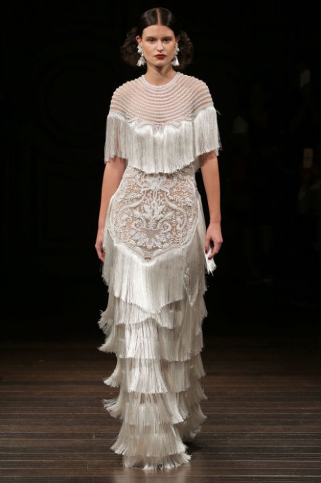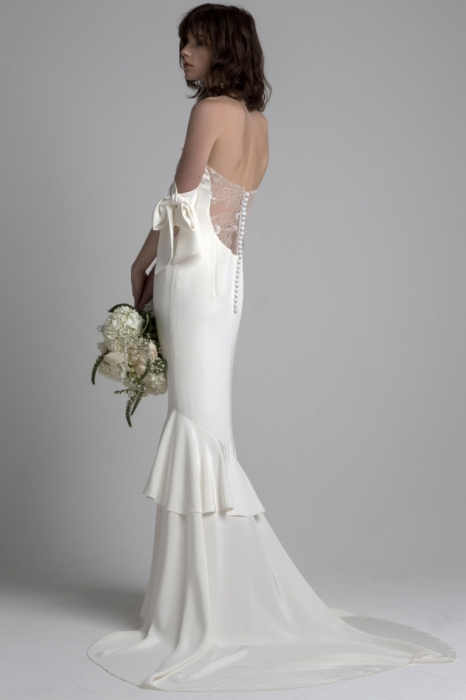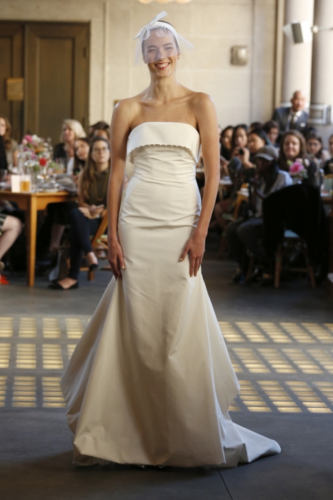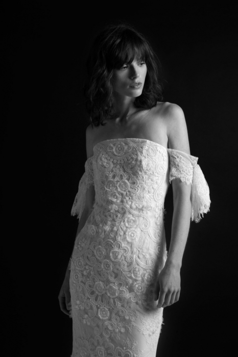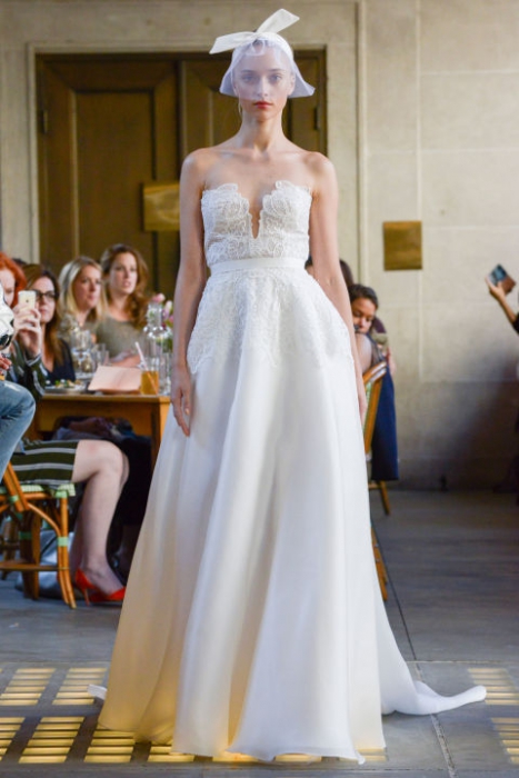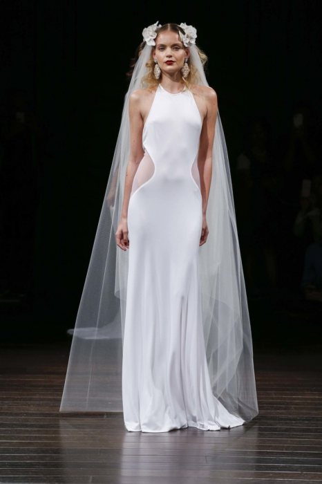Дальше всех с экспериментами и стайлингом зашла нью-йорская марка Houghton: невесты в их лукбуке будто вышли из стритстайла. Они носят нарочито небрежные платья на бретельках, а вместо жемчуга надевают на шею чокеры. Хит наших вишлистов — наряд из сетки, как у хип-хоп див.