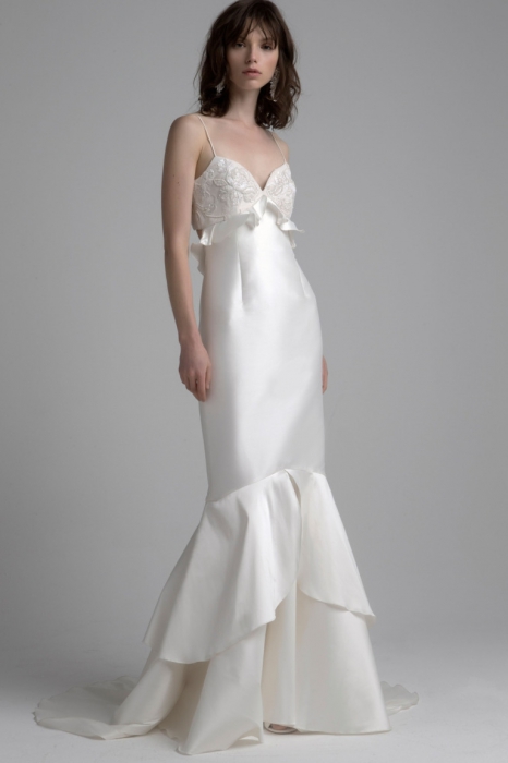Брендом Sachin & Babi занимается супружеская пара Сачина из Индии и Баби из Нью-Йорка. В сезонных коллекциях они пересматривают базовый гардероб и экспериментируют с принтами, а в свадебных — не отходят от классических силуэтов, но все равно кажутся прогрессивными. Дело в деталях: обратите внимание на прием с жемчугом. Излюбленный невестами материал Sachin & Babi используют не для украшений, как мы привыкли, а для декора завязок платья и бретелек.
