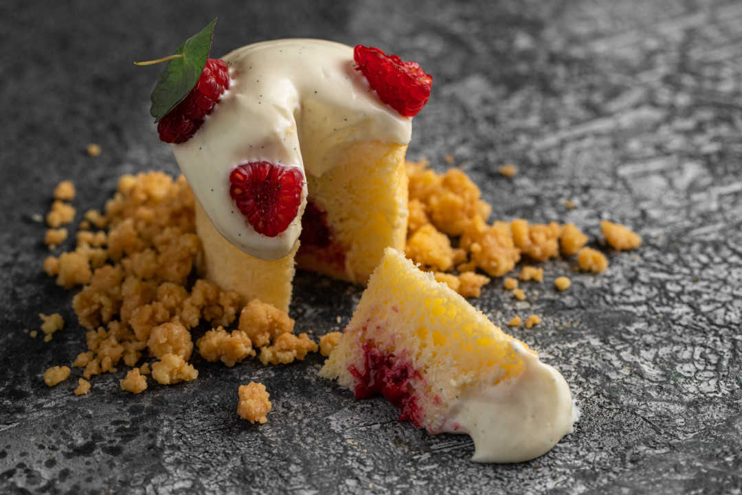 В меню есть и японский хлопковый чизкейк - нежнейший и тающий во рту десерт. В составе - бисквит, ванильный ганаш, крамбл, малиновый гель и свежая малина.
