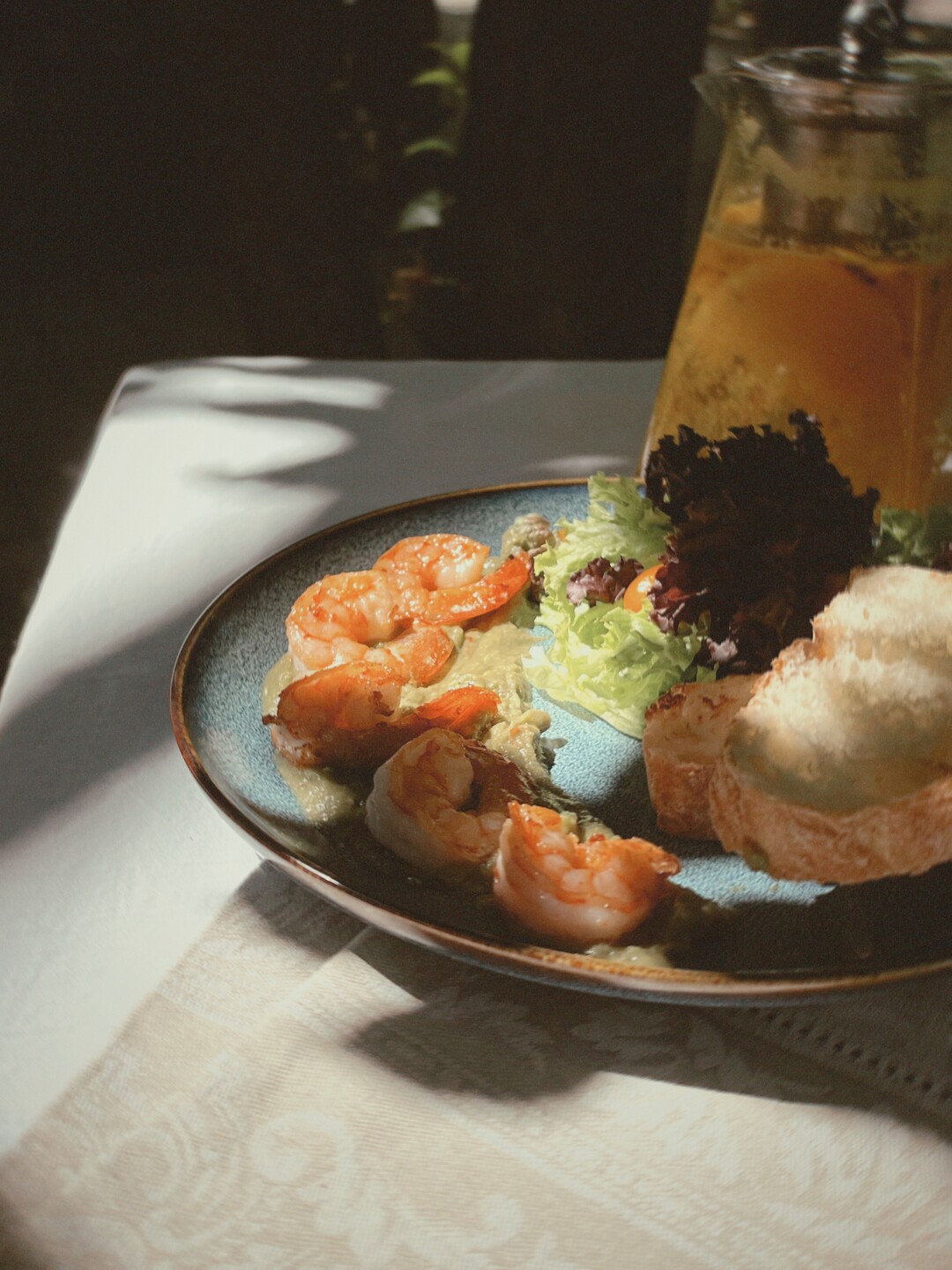Вставать рано, чтобы позавтракать здесь, не придётся. Завтраки подают весь день. Это приятно, особенно в выходные. В субботу и воскресенье в первой половине дня, кстати, гостей к завтраку ждёт приятный подарок. Какой именно – говорить не будем. Сохраним интригу. Не останавливаемся на завтраках и идём дальше. Приятно удивили сочетанием текстур пикантные креветки на подушке гуакамоле. Свежо и очень ароматно. В “Провансе” удобно проводить деловые встречи: центр города, действительно вкусно, уютно, есть розетки и хороший wi-fi.