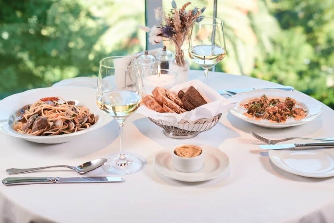 Юрий выбрал черноморские рапаны в сливочном соусе с томатами, а Никита - макароны по-флотски в морском варианте с добавлением вонголе.