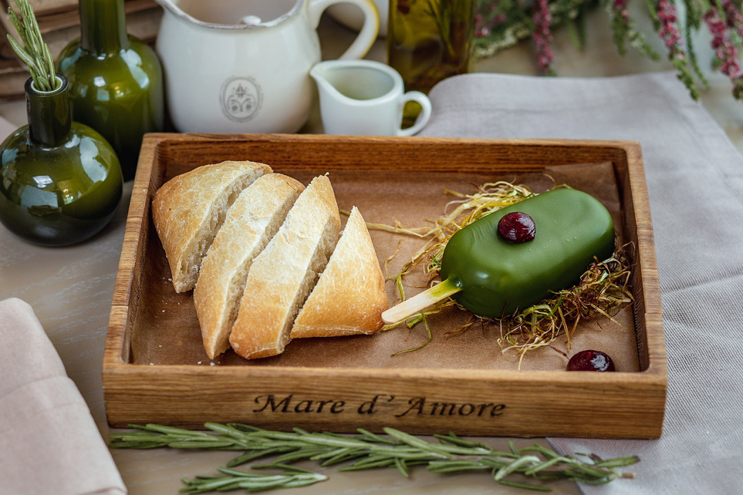 Сверху выкладываем слайсы из зеленого яблока, предварительно политые цветочным медом и соком лайма, рядом выкладываем ржаную булочку или обжаренный на сухой сковороде бородинский хлеб.