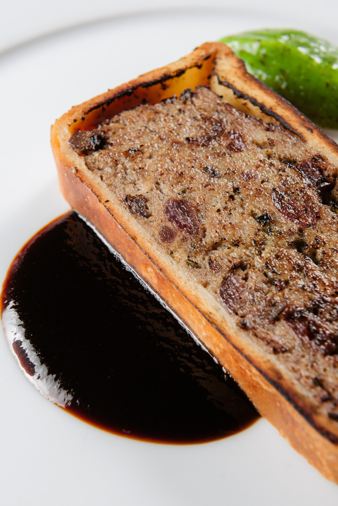 Мясной террин с трюфелем, запеченный в паштетном тесте, подается с соусом демигласс и пряным джемом из киви