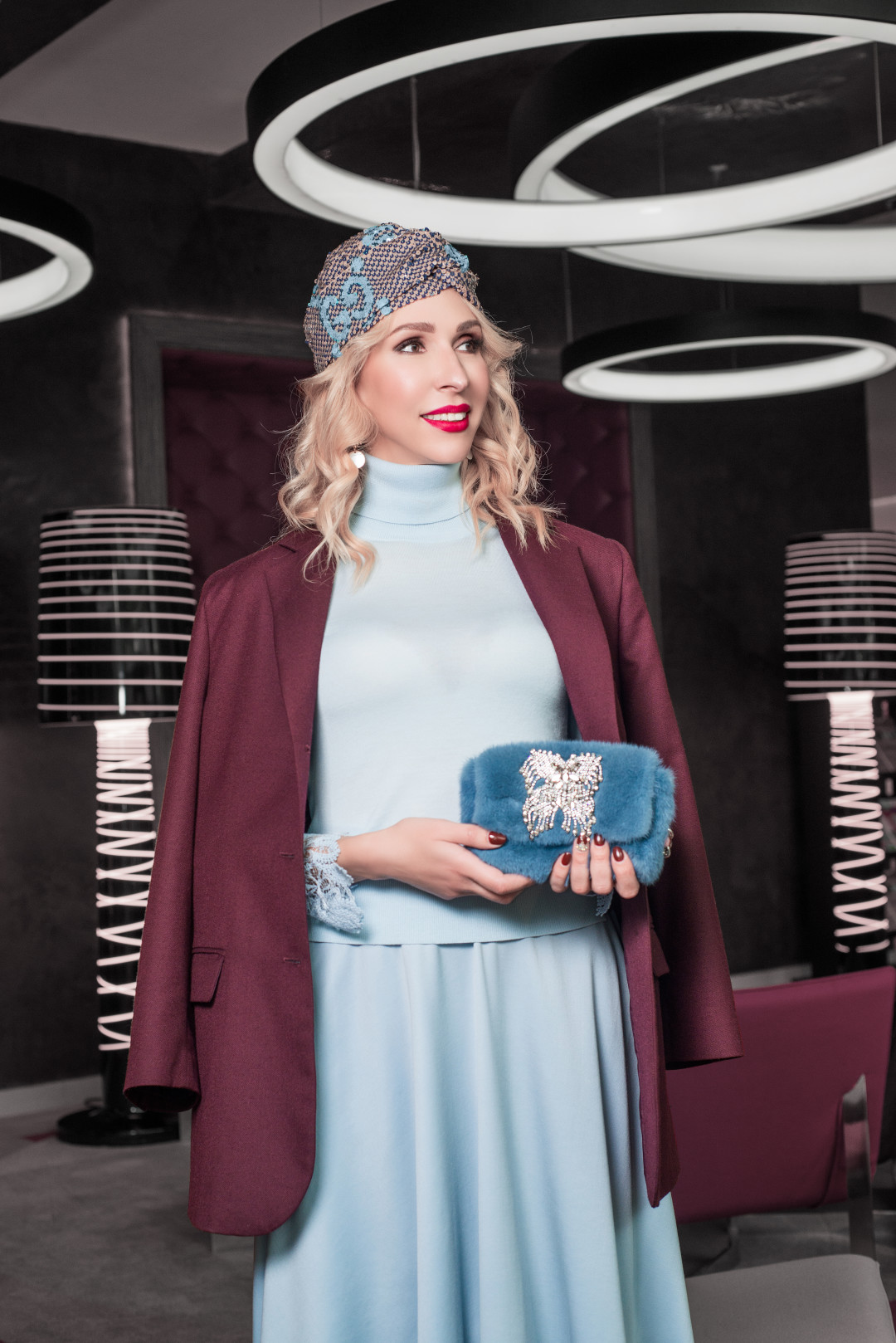 Жакет Oxana Gumenyuk, юбка Oxana Gumenyuk, повязка на голову Gucci, свитер Ermanno Scervino, cумка Ermanno Scervino