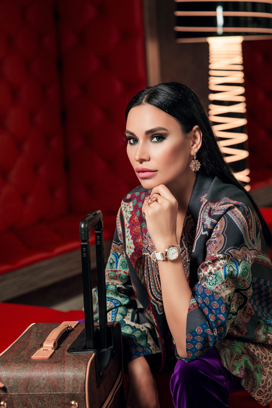 Туника, брюки – все Etro, кольцо и серьги Мaxim Demidov, чемодан Etro, часы Omega