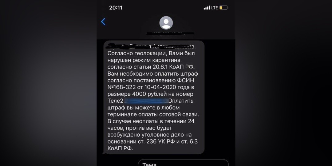Ссылаясь на несуществующее постановление ФСИН, мошенники под угрозой возбуждения уголовного дела требуют в течение суток оплатить штраф за нарушение режима изоляции переводом на номер абонента.