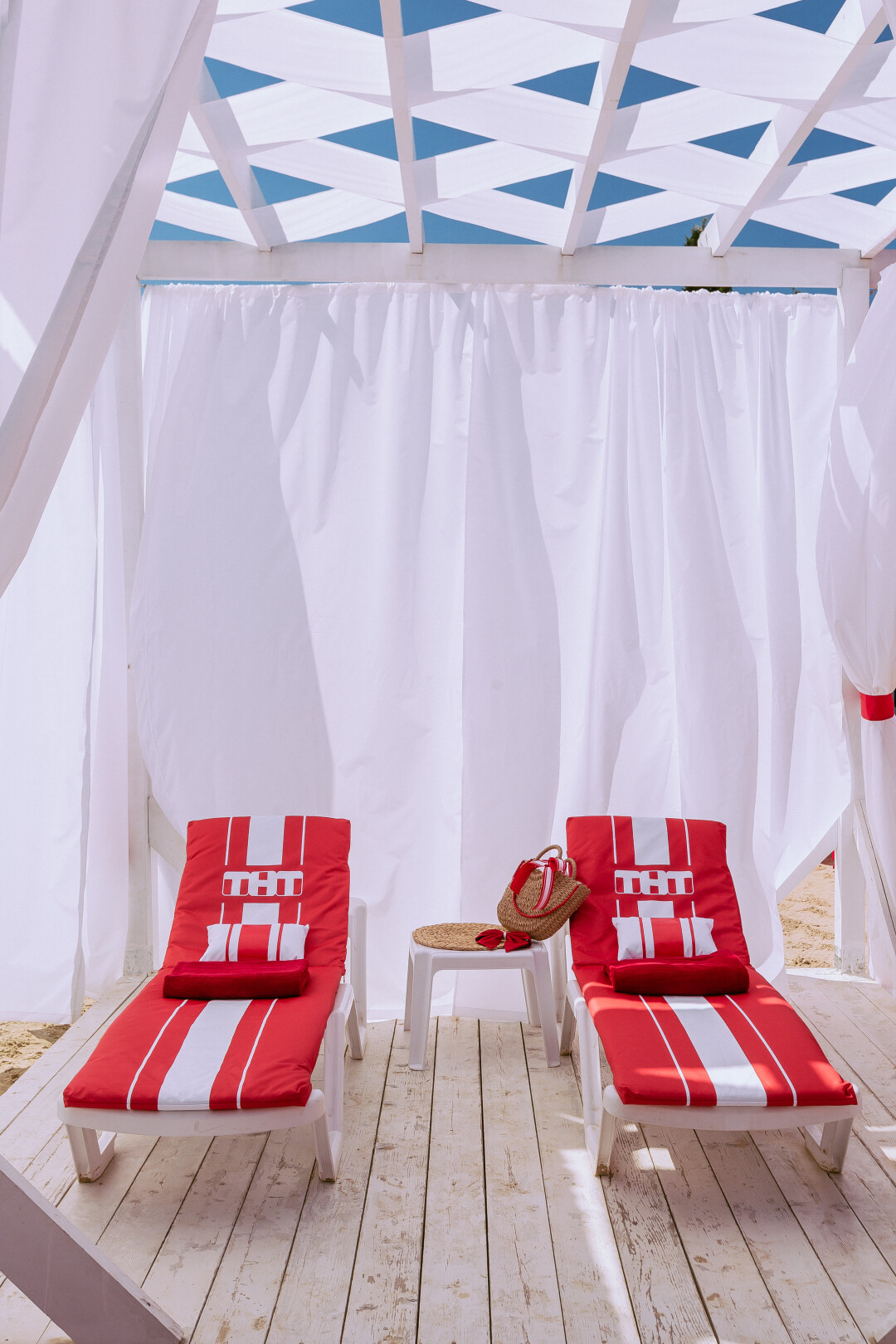 Полоска – еще один хит сезона, который лаконично вписался в морскую эстетику. Концепция пляжа ТНТ отражает свежие идеи телеканала, задающие современные тренды не только на ТВ, но и офлайн.