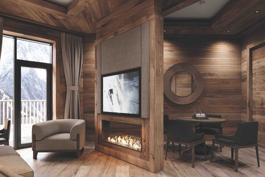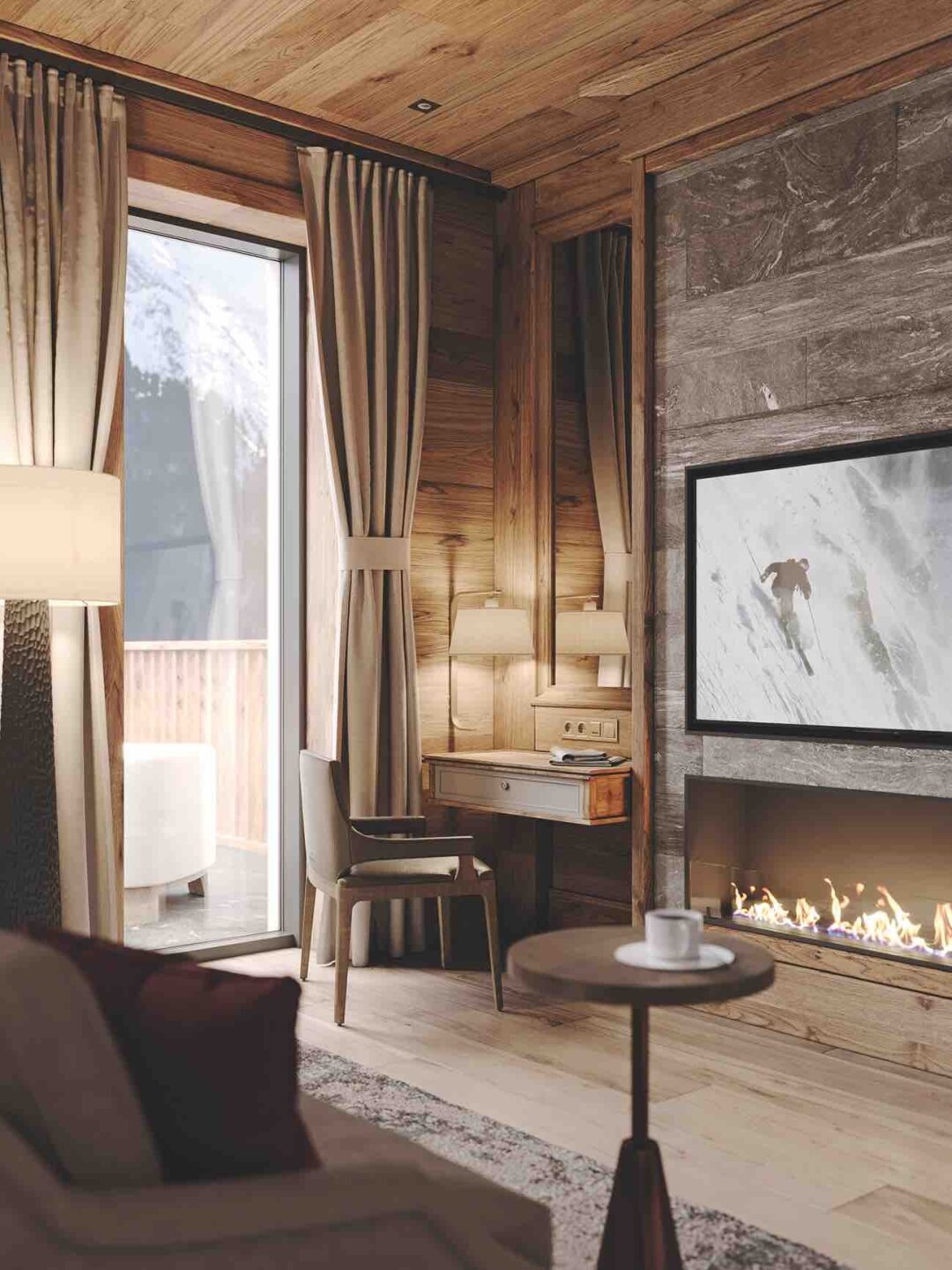 В интерьерах царит тактильная роскошь: отреставрированное столетнее дерево, итальянская кожа, льняные шторы. В номерах Deluxe и Luxe — камины, система «Умный дом» и панорамные окна, открывающие вид на горы. Каждый уголок шепчет о гармонии пространства, где природа и архитектура звучат в унисон.