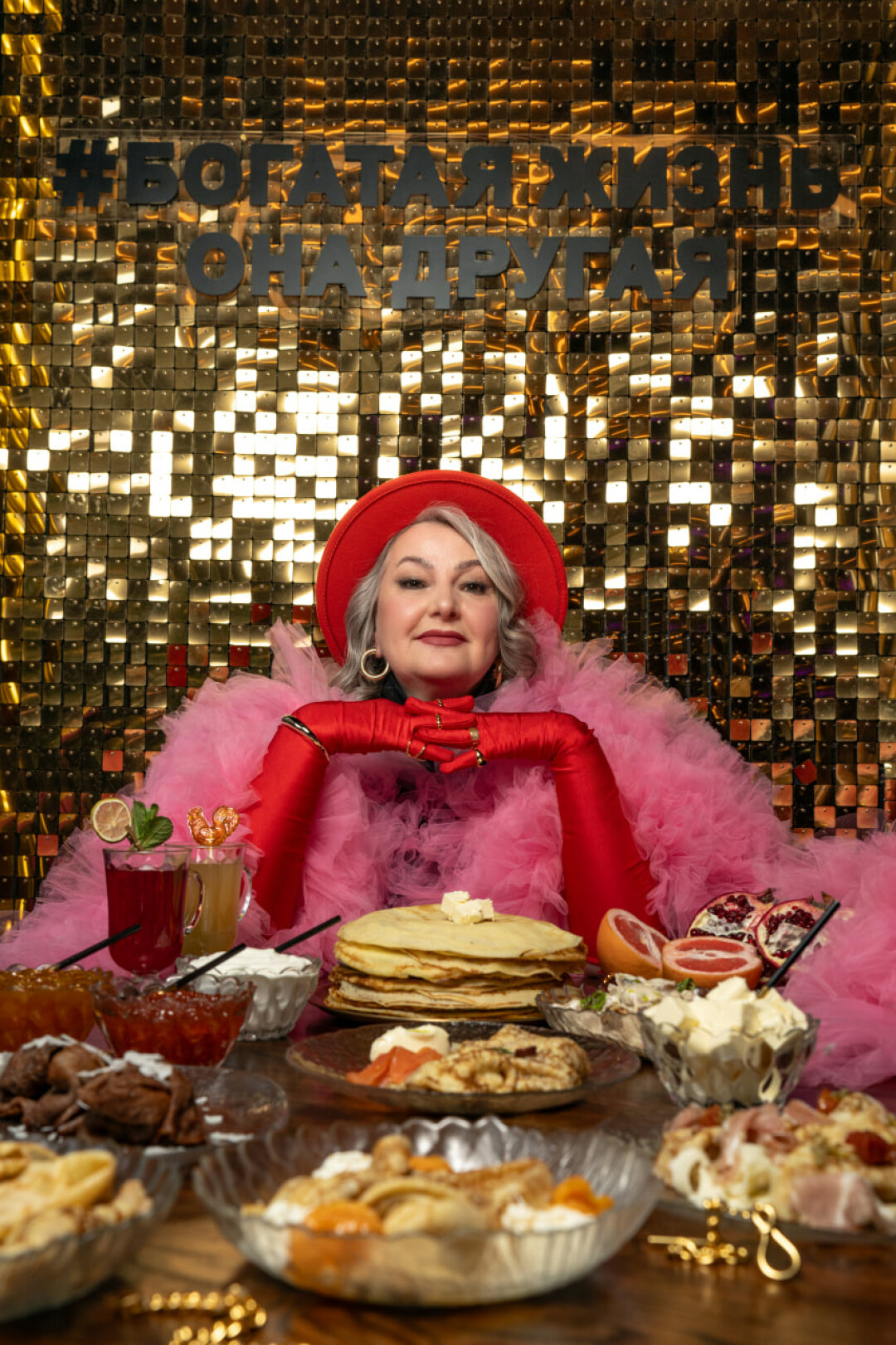 Представьте, если бы на Масленицу блины пекла не просто бабушка, а итальянско-кавказская бабушка, которая предпочтёт фартуку роскошную накидку и не снимет свои кольца даже замешивая тесто.