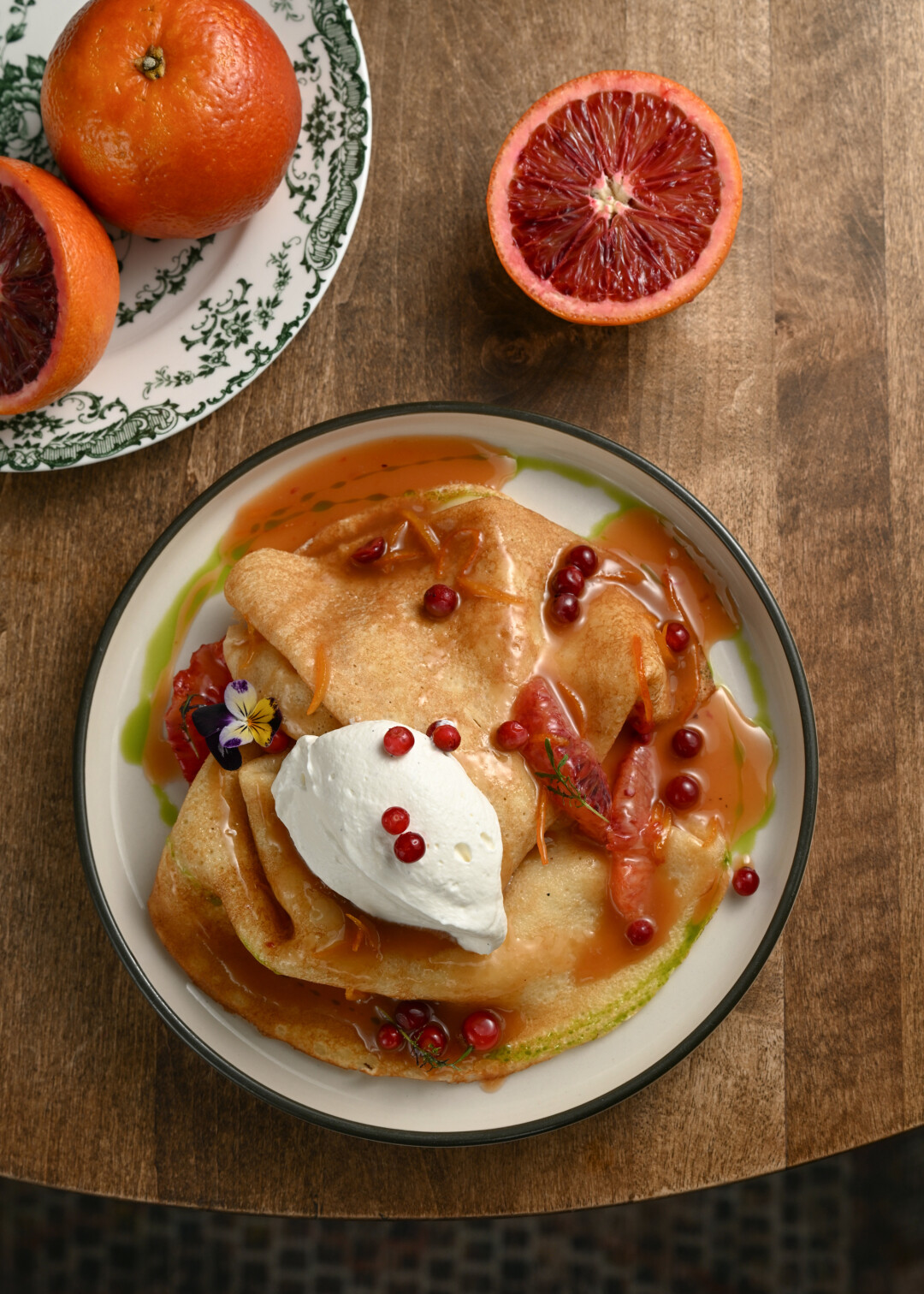 - блинчики Креп Сюзетт с красными апельсинами, кремом шантилье и апельсиновым ликером